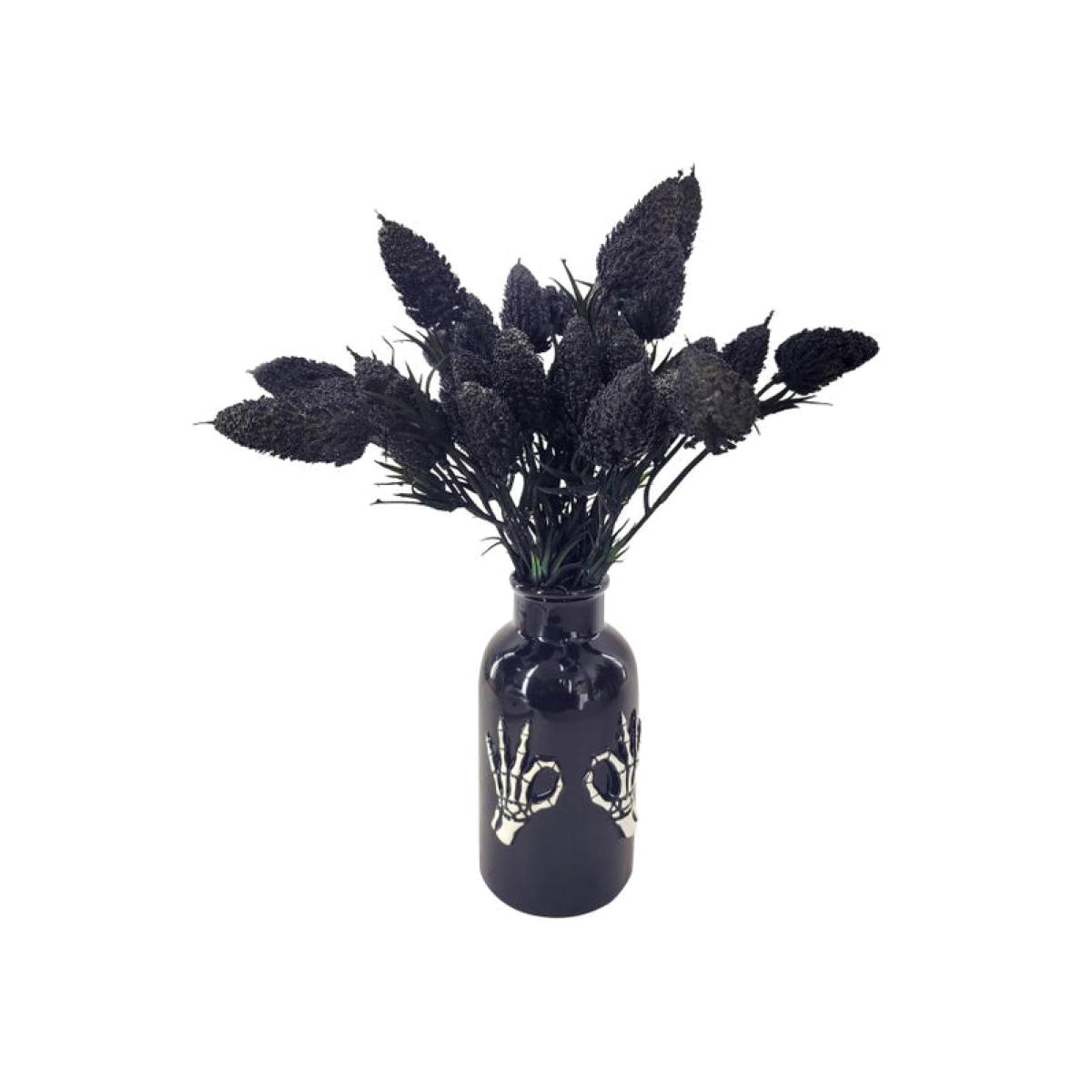 * Perfect Centrepiece for Spooky Season * Beautiful Floral Arrangement * No Maintenance Needed Add a spine tingling twist to your Halloween styling with the Hocus Pocus Artificial Fruit Bouquet in Skeleton Hand Vase. The bold black ceramic vase gripped by eerily detailed skeleton hands makes a dramatic centrepiece. Bursting with rich artificial fruit foliage, it's a feast for the eyes: no tricks, just tasteful treats. Whether perched on a mantel or taking pride of place on the dining table, it's sure to spark conversation.