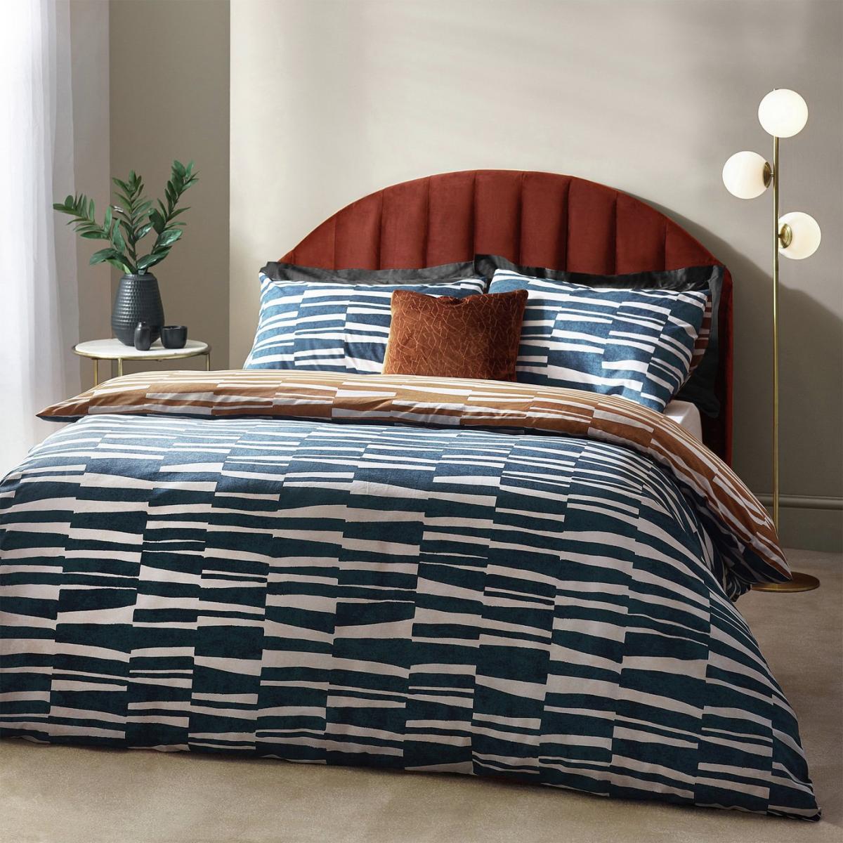 Go to sleep in style with the Piper duvet cover set, inspired by modern, minimalist and abstract art. Create an impact with this modern design, adorned with striking irregular stripes in a tone reminiscence of dusk skies. The reverse features a coordinating print in warming bronze, to offer an alternative design when you need a midweek refresh. A thoroughly modern classic, with a forward-thinking design which will add sophisticated style to your interior. Featuring a multitude of printed abstract shapes printed on soft, cotton rich fabric. This item carries the STANDARD 100 by OEKO-TEX logo, which means you can be certain that every component has been tested for harmful substances and is therefore harmless to human health. 60% cotton , 40% polyester. 144 thread count. Set includes 1 duvet cover and 1 pillowcase. Bed size: single. Length 200cm, Width 135cm. Reversible. Buttons for fastening. Standard pillowcase (s). Pillow case length 75cm, Width 50cm. Reversible pillowcase (s). Machine washable.