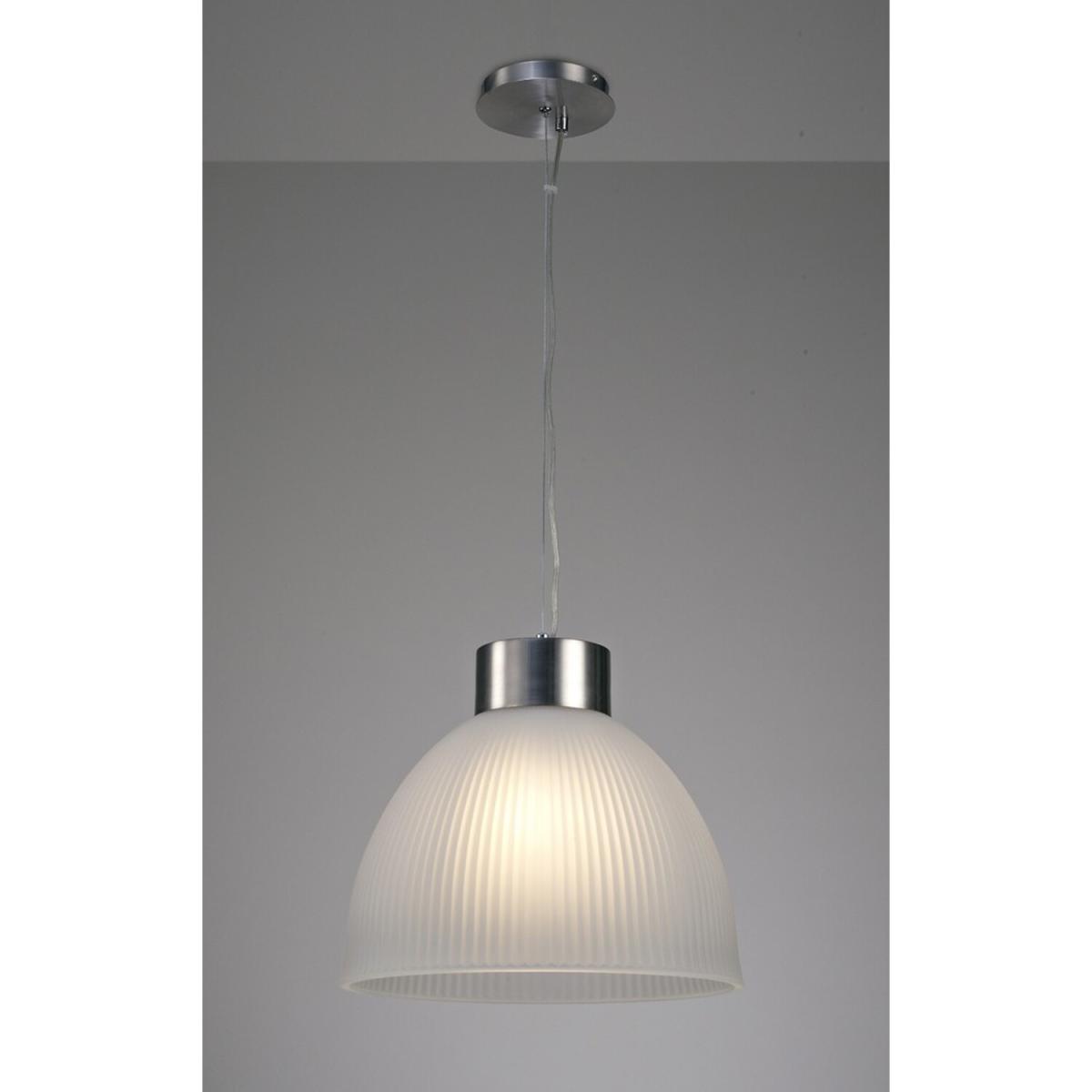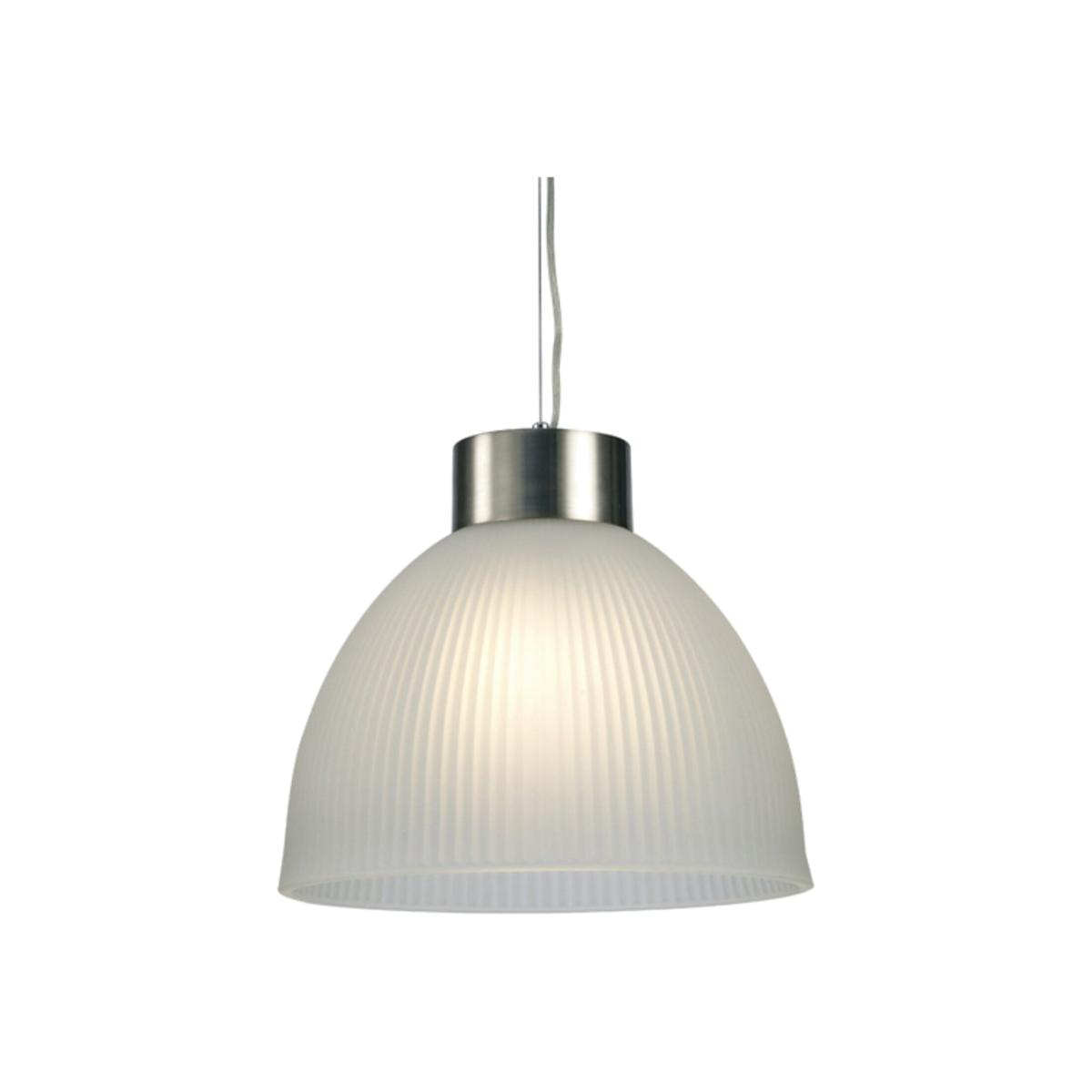 This E27 single adjustable pendant displays a flavour of an industrial highbay but in a contemporary design by using a simplistic circular satin nickel framework to host the dome shaped frosted glass. The ribbed texture and moulding of the glass create a three dimensional feature which throws out amazing lines and shadows when illuminated.