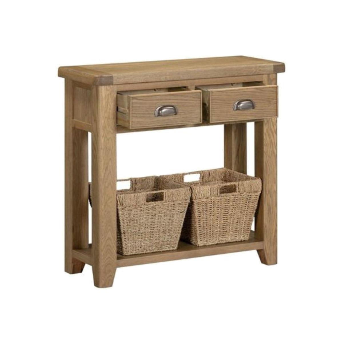 This Holcombe Console Table provides ideal storage for your home. This beautifully crafted console table is designed to blend timeless charm with practical application. It is made using real wood and veneered board and finished with a rustic oak finish, which is hardwearing and looks great. Constructed traditionally with heavy legs and a top, with 2 polished wooden drawers featuring metal cup handles and a pair of hand-woven baskets to add further finesse and additional storage. This console table is supplied fully assembled and ready to use. The design is ideal for your hallway, living room or dining room.