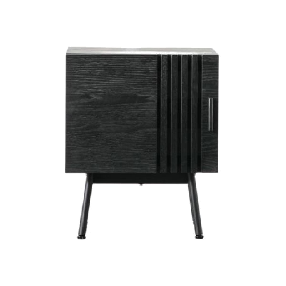 This stunning side table offers a striking contemporary look, with the slatted design on the door adding interest. Crafted using solid oak for the slats and oak veneers, the matt black finish beautifully shows the grain of the wood and pairs perfectly with the matt black metal legs. A matt black solid oak handle adds the finishing touch. The unit is part of a collection which offers a selection of cabinets. The collection is part of our Packed-Flat Design Project, offering easy delivery to any room in any property, whilst reducing the packaging needed. Easy assembly is required, but all the tools needed are supplied. Material:Oak Veneer. Colour/Finish: Black.