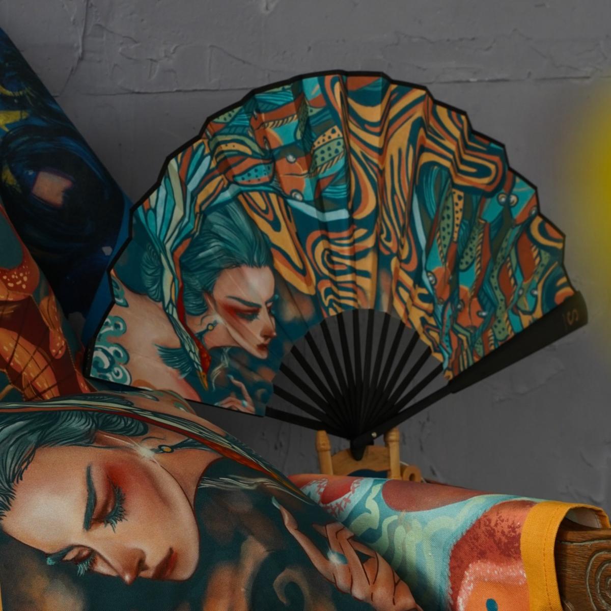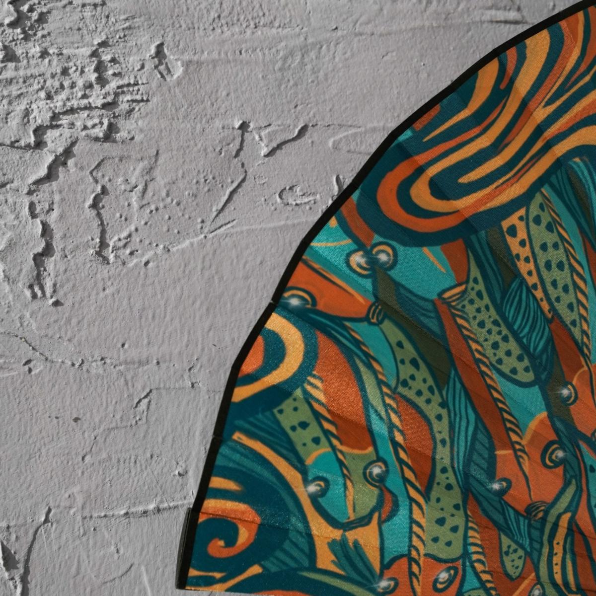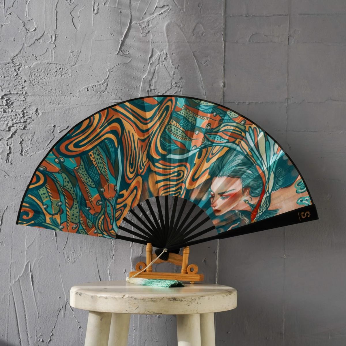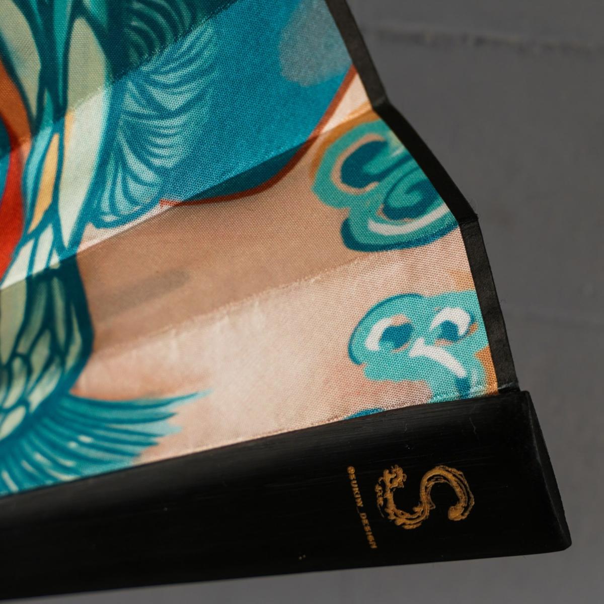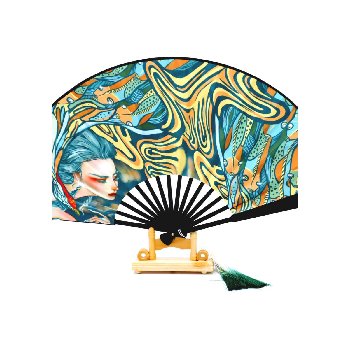 Fan with coordinating print crafted from silk satin and wood. Comes with bamboo stand & teal tussle attached to the fan (removable ) Lightweight, foldable, and easy to carry or decorate.