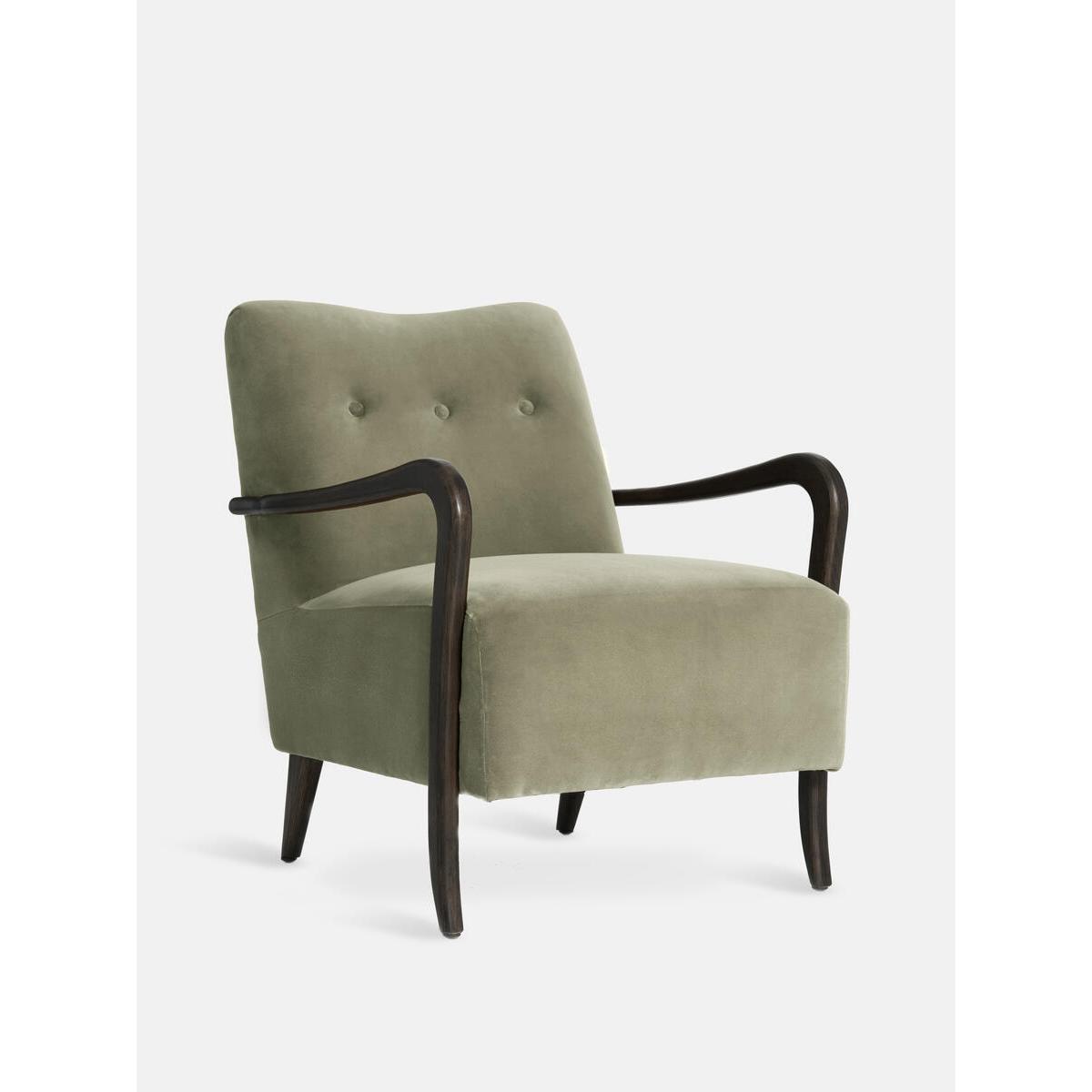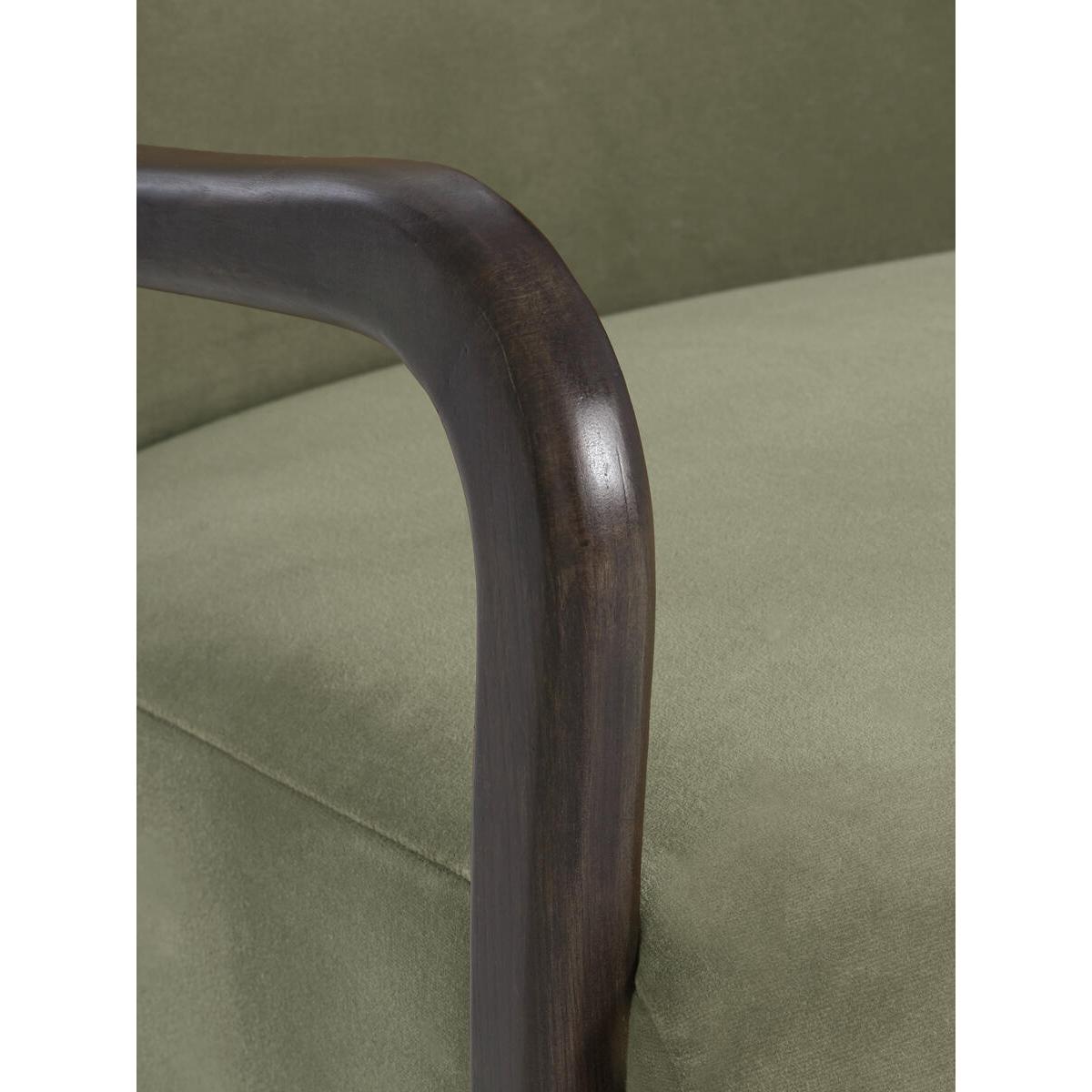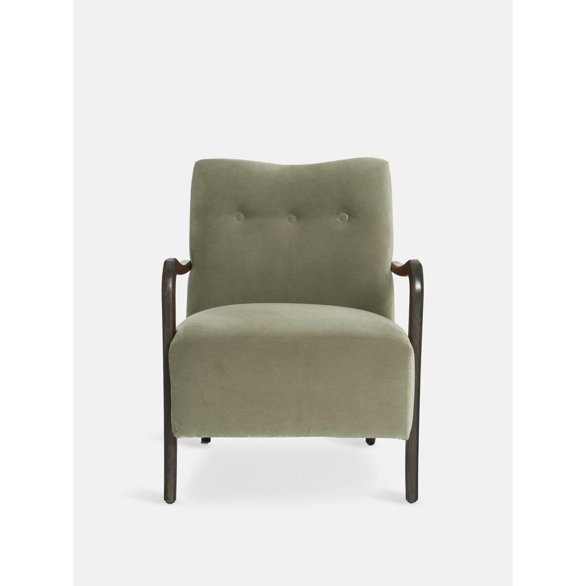 Inspired by the armchairs found in our lounge spaces at High Road House, our Holland chair in sage cotton velvet has a deep-sitsilhouette and large foam cushions. The clean lines arecomplemented by a button-back detail and slim ash-wood arms. Cotton velvet upholstery. Button-back detailing. Ash-wood arms. Inspired by vintage chairs at High Road House.