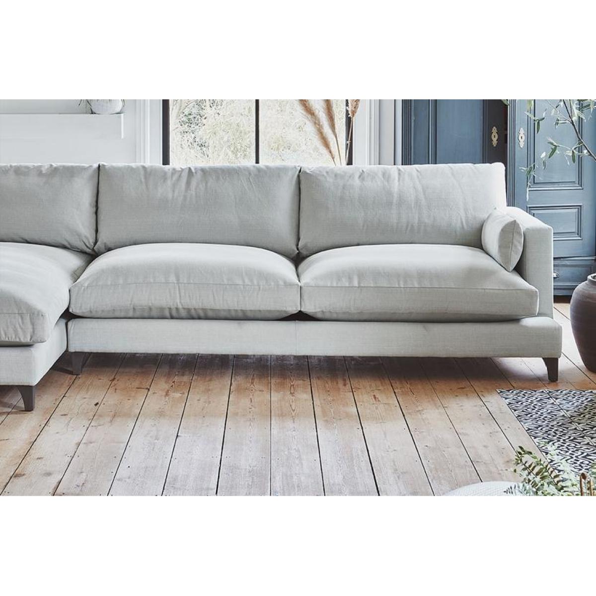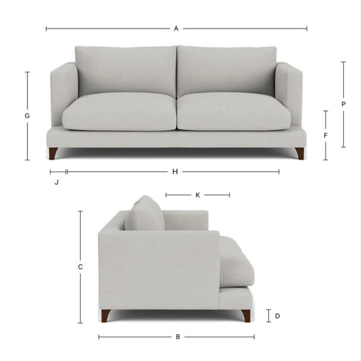 The Holland large sofa features an unusual and striking design with the front of the arms set slightly back on the front base of the sofa. The cushions are wonderfully plump, filled with foam and wrapped in a soft fiber you are sure to sink in. Choose from our collection of over 170 fabrics and leathers to create the sofa you've always wanted, whether that's in a soft linen, a stain resistant velvet or a classic leather. All our sofas are handmade by expert craftspeople in the UK, using a combination of traditional skills, new technology and the finest materials. External (cm): - Width (A) = 212 - Depth (B) = 112 - Height (C) = 87 Seat (cm): - Width (H) = 184 - Depth (K) = 82 - Height (F) = 44 Arm (cm): - Width (J) = 14 - Height (G) = 65 Legs (cm): - Height (D) = 13 Frame Height (without Feet): - Height (P) = 52
