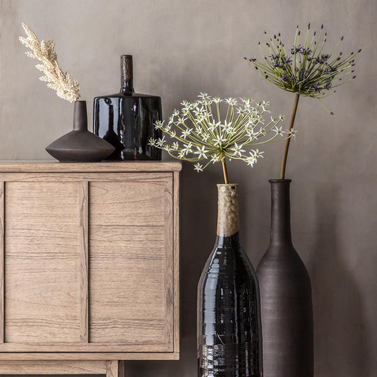 I love this little black vase for its versatile, contemporary look. Its sleek design and muted colour mean it works well in minimalist or modern interiors, whether on a shelf, mantelpiece, or centre of a dining table. It’s perfect for showcasing a single stem or a small posy of flowers for a simple, understated display. For practical styling, I’d suggest pairing it with neutral-toned vessels or incorporating it into a mixed materials setup with wood or concrete objects to add texture. Its compact size makes it ideal for small spaces or as a subtle accent piece that can bring a touch of sophistication without overwhelming a room.