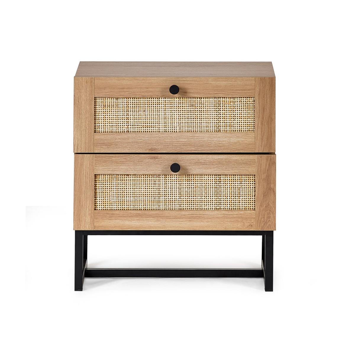 * Contemporary design* Natural rattan features* Industrial-style base* 2 large drawers for storage* Matching furniture available A stylish and functional addition to the bedroom, this high-quality bedside table fuses modern construction with retro design elements to elevate the aesthetic of your personal sanctuary. Crafted with a contemporary design, this unit combines natural rattan features with industrial-style framing to create a versatile design that can fit in with a variety of textures, colours and patterns. Designed to provide storage, the large drawers glide open effortlessly, providing a discreet space for your essentials. The spacious tabletop provides ample room for a bedside lamp, your favourite books, or a cup of soothing tea, ensuring everything you need for a restful night's sleep is within reach. Coordinate with the matching collection featuring chest larger storage pieces.