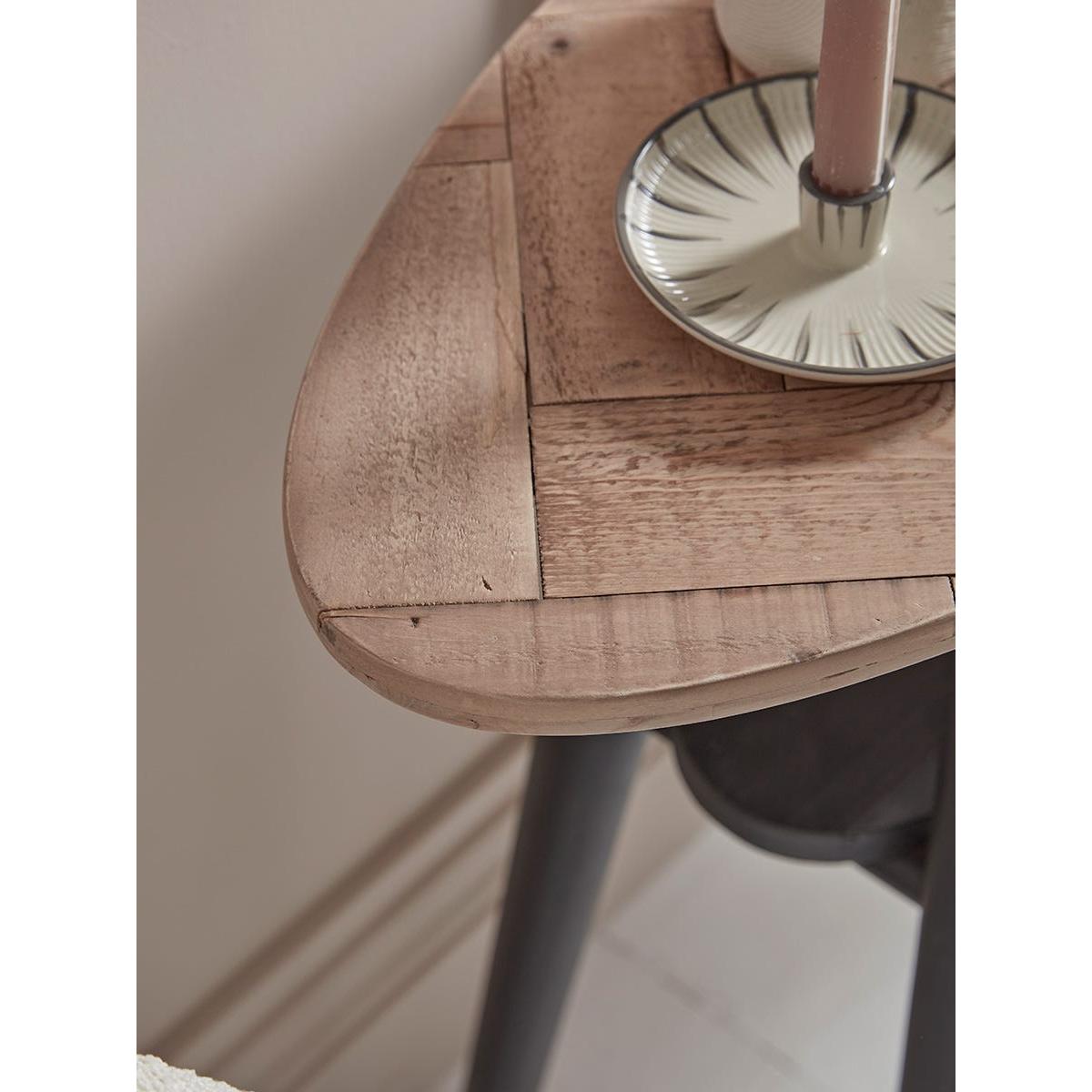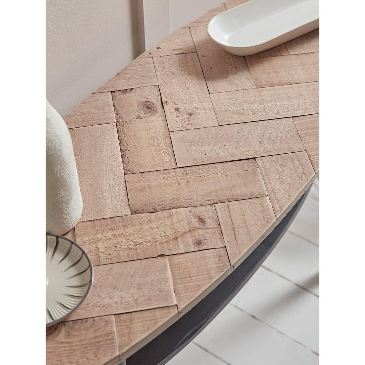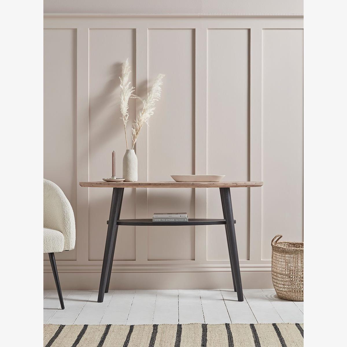 Our Hollis range marries a striking combination of herringbone panelled reclaimed wood set in a framework of matte black, making it perfect for modern neutral settings where the quality and textural depth of materials are paramount. Angular dark legs contrast in this elegant rounded console with the cooler tones of the table top.