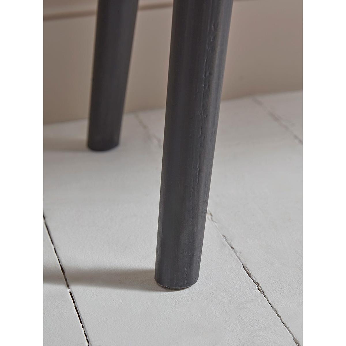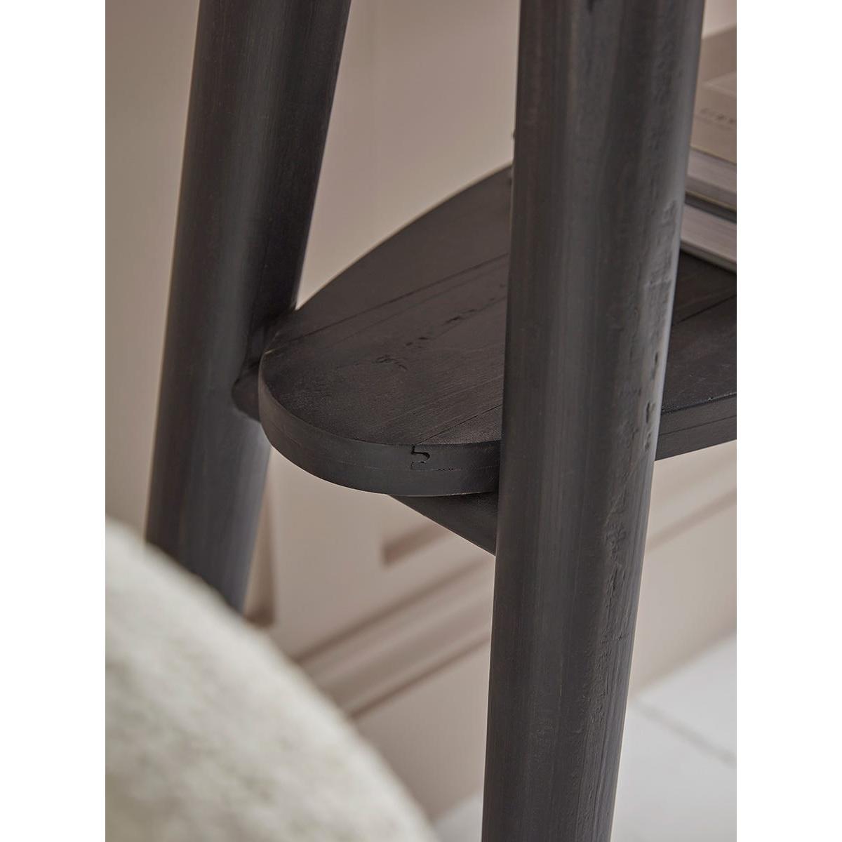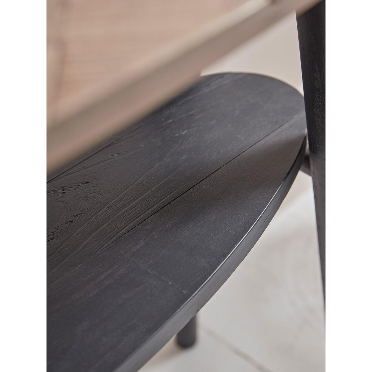 Our Hollis range marries a striking combination of herringbone panelled reclaimed wood set in a framework of matte black, making it perfect for modern neutral settings where the quality and textural depth of materials are paramount. Angular dark legs contrast in this elegant rounded console with the cooler tones of the table top.