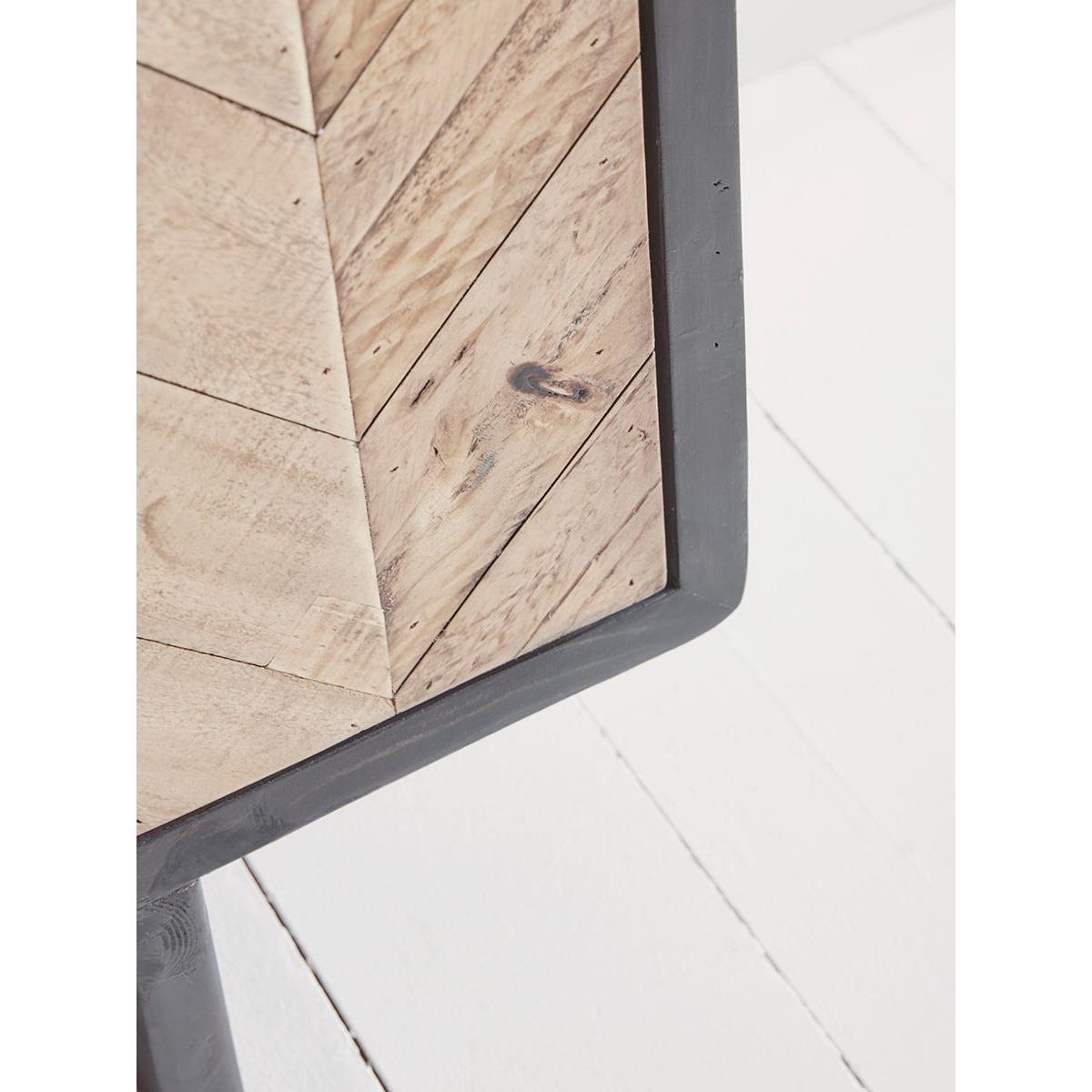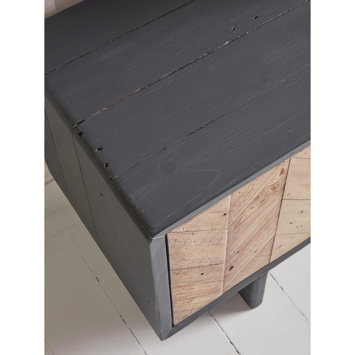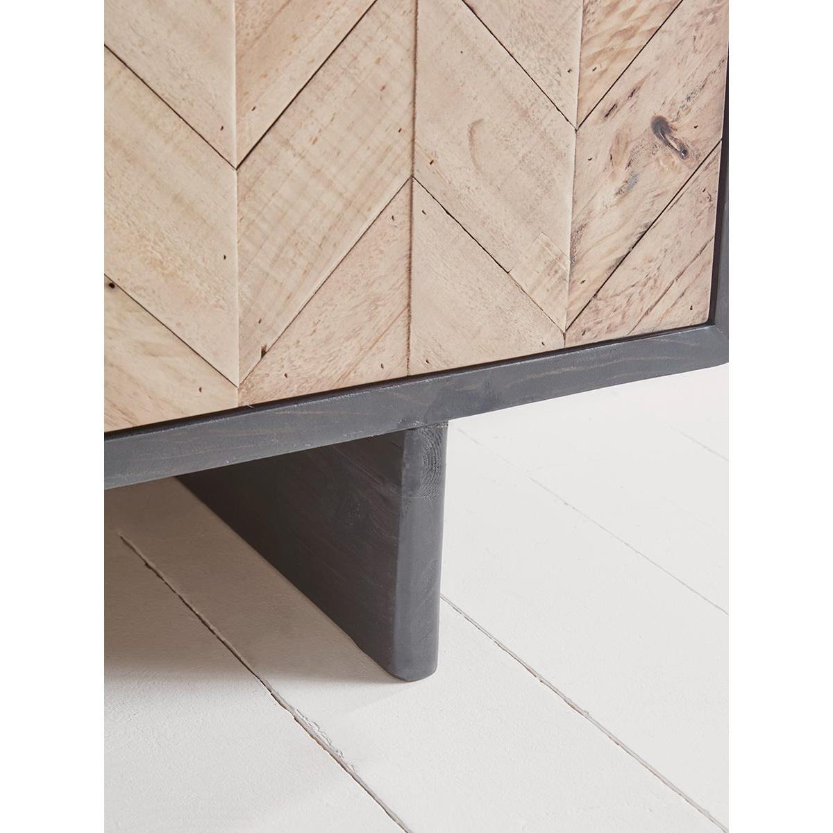Our Hollis range marries a striking combination of herringbone panelled reclaimed wood set in a framework of matte black, making it perfect for modern neutral settings where the quality and textural depth of materials are paramount.  The Hollis media unit sees two cupboard areas with shelves flanking a central alcove which has a shelf and holes in the back to channel electric cables through. The width gives plenty of space for wide screens.  A matching sideboard is also available.