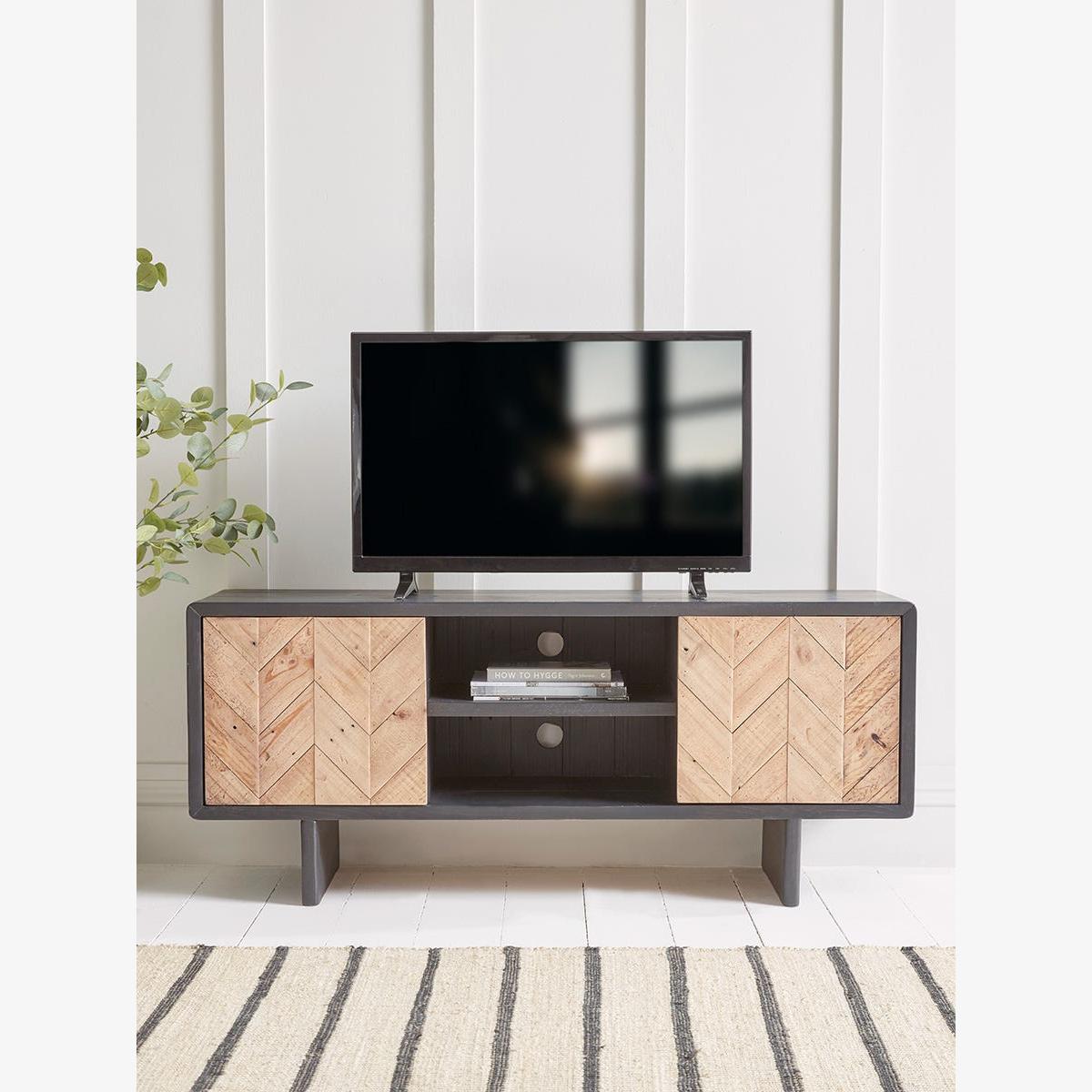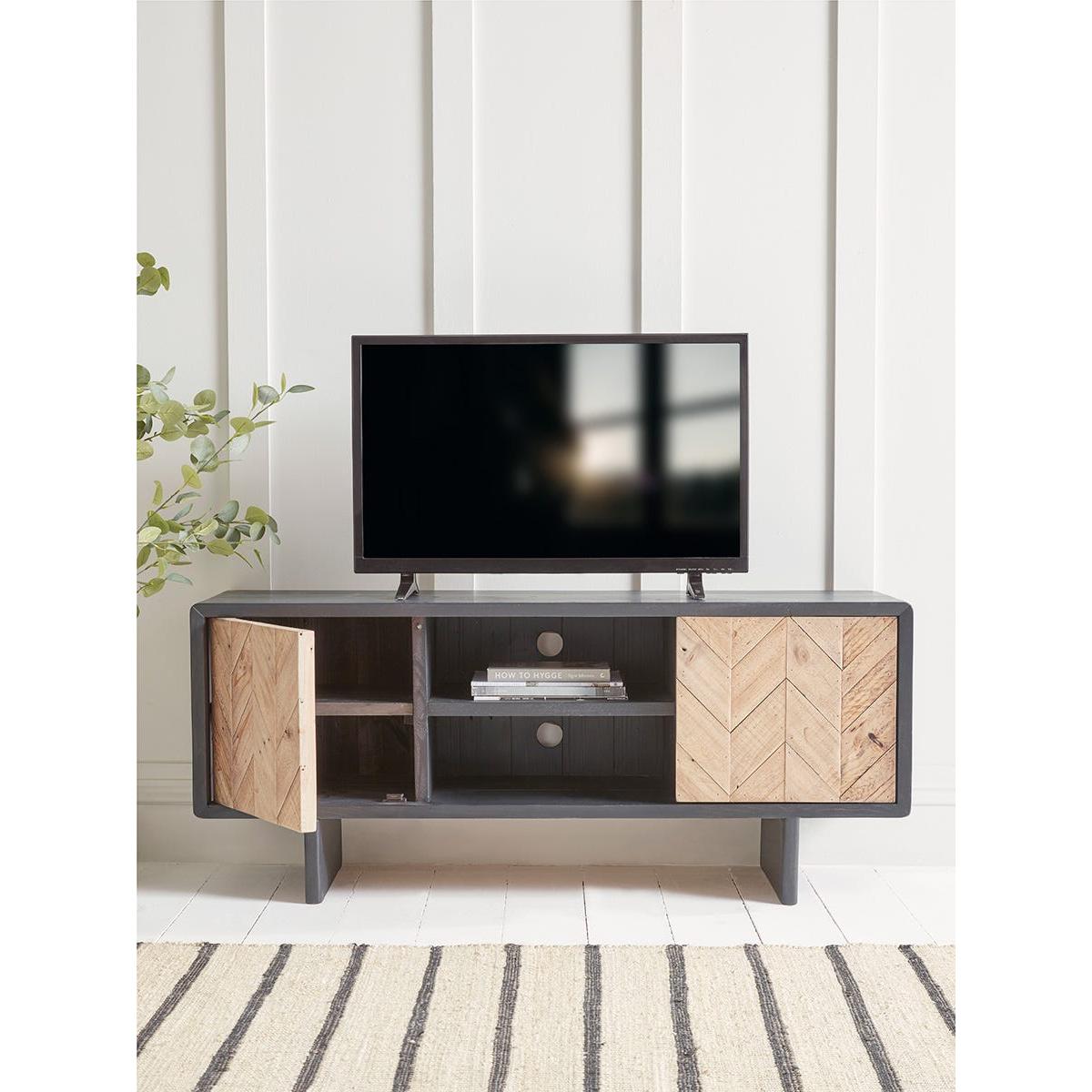 I’m a fan of the Hollis TV stand for its clean lines and mixed-material look - the matte black frame gives it a modern edge, while the herringbone timber doors add a touch of warmth. It sits neatly in Scandi, industrial or contemporary schemes, and the two central shelves with cable cut-outs keep electronics organised without sacrificing style. For practical styling, keep the top surface uncluttered: a slim soundbar, a low-profile plant and one or two framed prints work well. Use matching baskets or boxes inside the cupboards to hide games and remotes, and stack a few books in the open section to give visual interest without overcrowding.