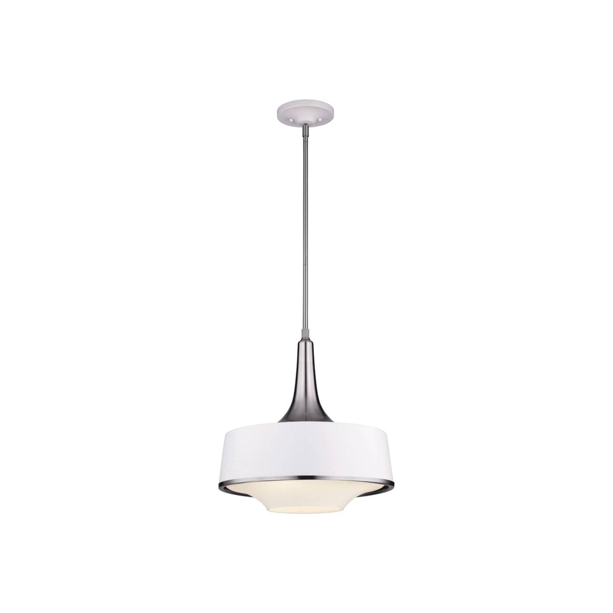 This pendant is rich with design detail. The matte, textured white shade contrasts beautifully with the spun metal profile and matching metal trim. The white, opal etched glass has a contemporary silhouette to soften the light while still allowing direct down light through the centre. The canopy is painted to match the shade. Also available in this range Mini Pendant.