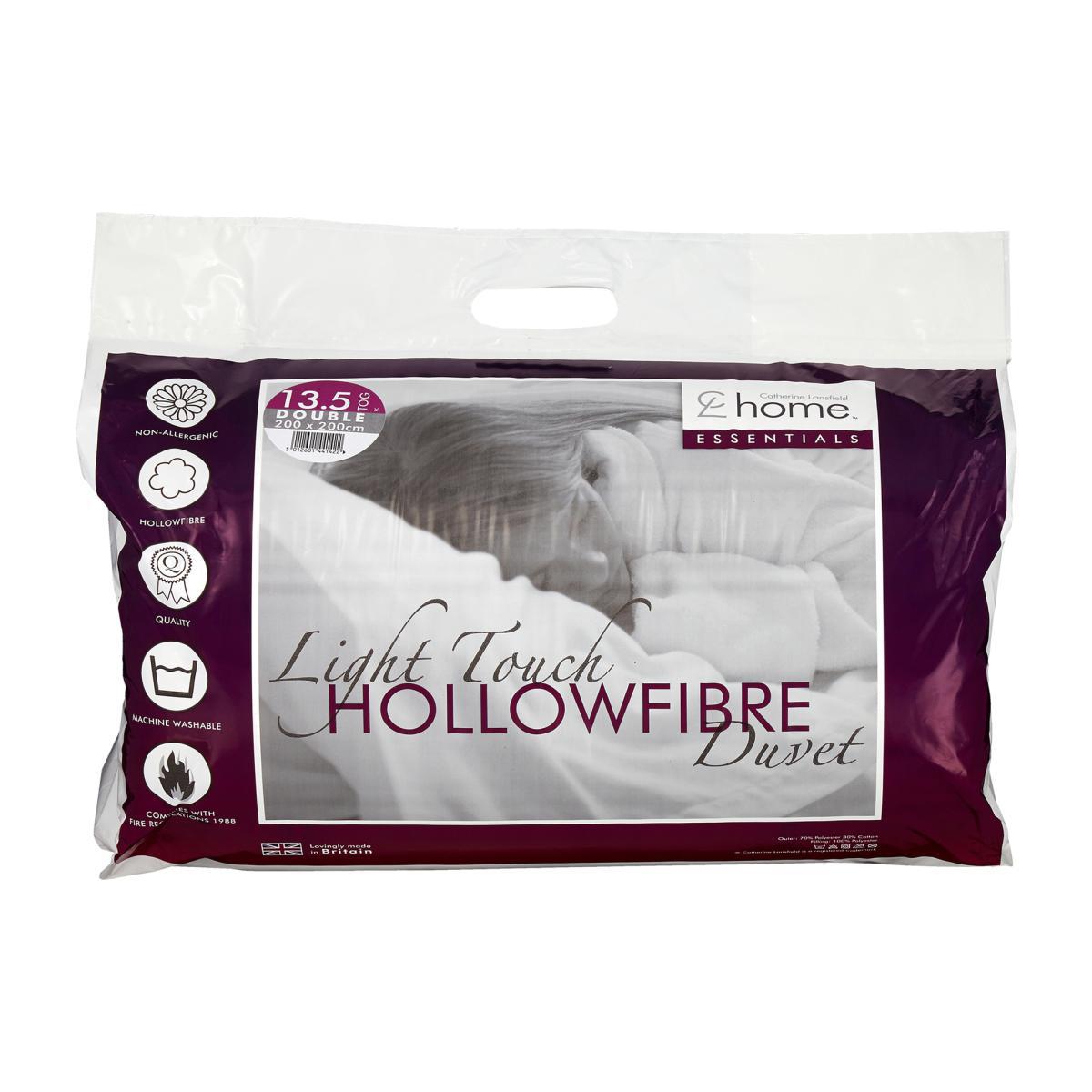 This product will be dispatched by one of our trusted suppliers. You’ll be contacted by their selected courier about your delivery. Catherine Lansfield is renowned for style and quality - designed and developed in Great Britain. This soft to touch hollowfibre offers a warm yet breathable, lightweight and low maintenance product, perfect for everyday use. This product is a 13 tog which is ideal for autumn into winter months. Ethically sourced overseas and made to strict quality and human-ecological safety standards. Made from a 70% Polyester 30% Cotton blend. This duvet is machine washable in a large capacity machine and easy to dry, requiring minimal fluffing. Single Duvet- 235x200cm, Double Duvet- 200x200cm, King Duvet- 220x230cm, Super King Duvet- 220x260cm.Search 'Catherine Lansfield Hollowfibre' to see the full collection.