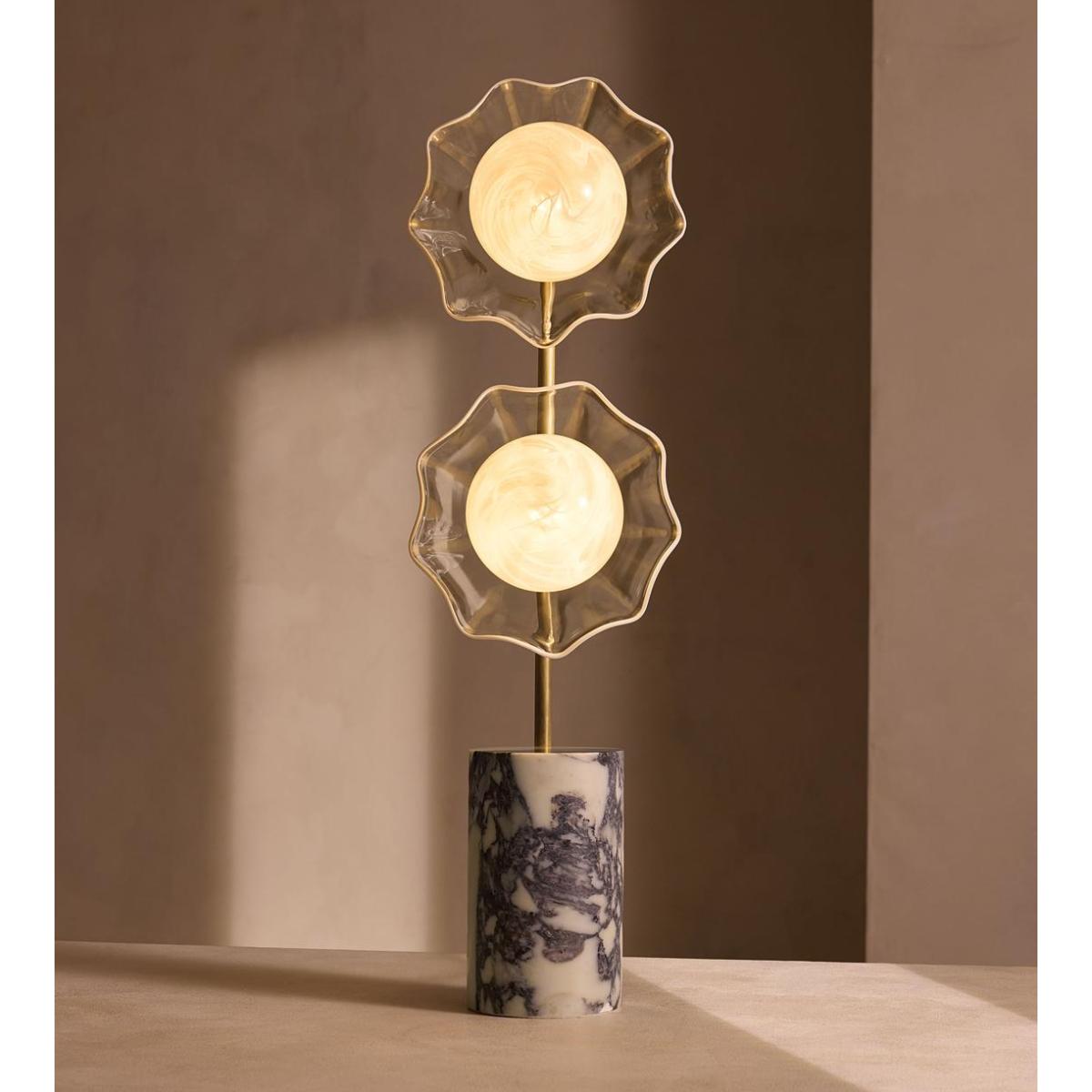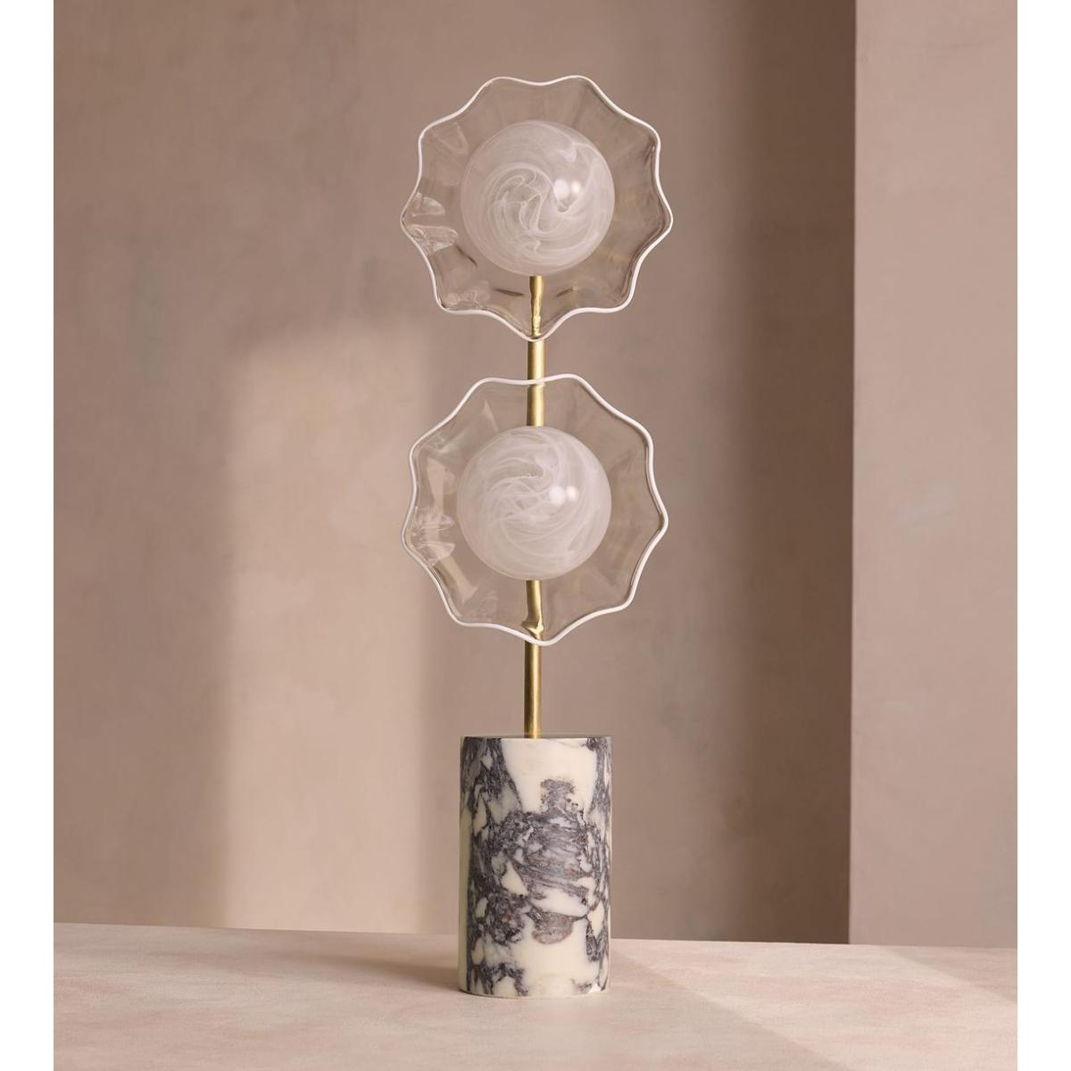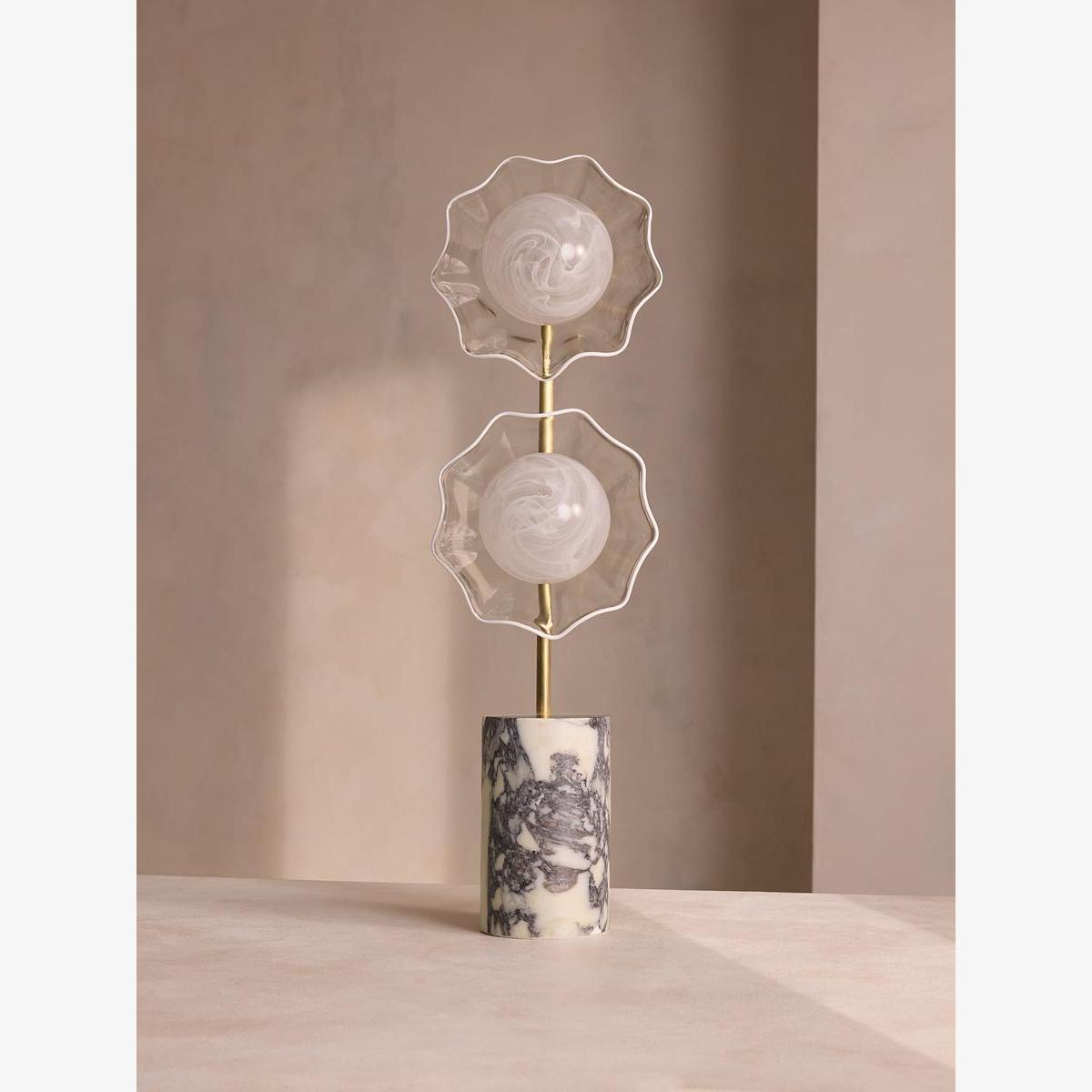 Double-layered glass creates two scalloped bases and orb-shaped bulbs for a statement design. Set on scalloped bases surrounded by contrasting edges, the globe-shaped bulbs of our Holly table lamp are crafted from white swirl glass. Its slender brass stem is secured by a cylindrical base carved from black and white Calacatta Viola marble.