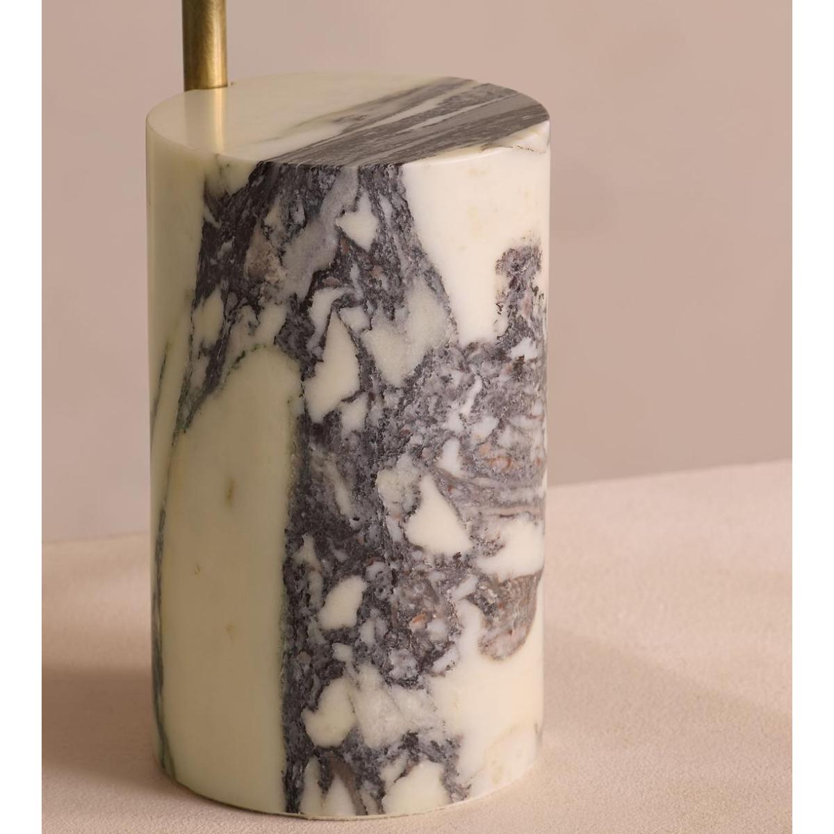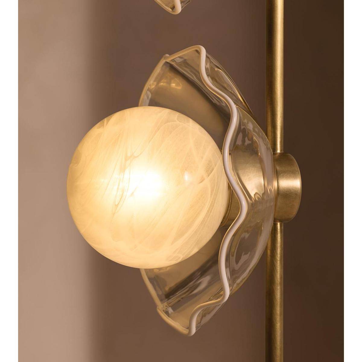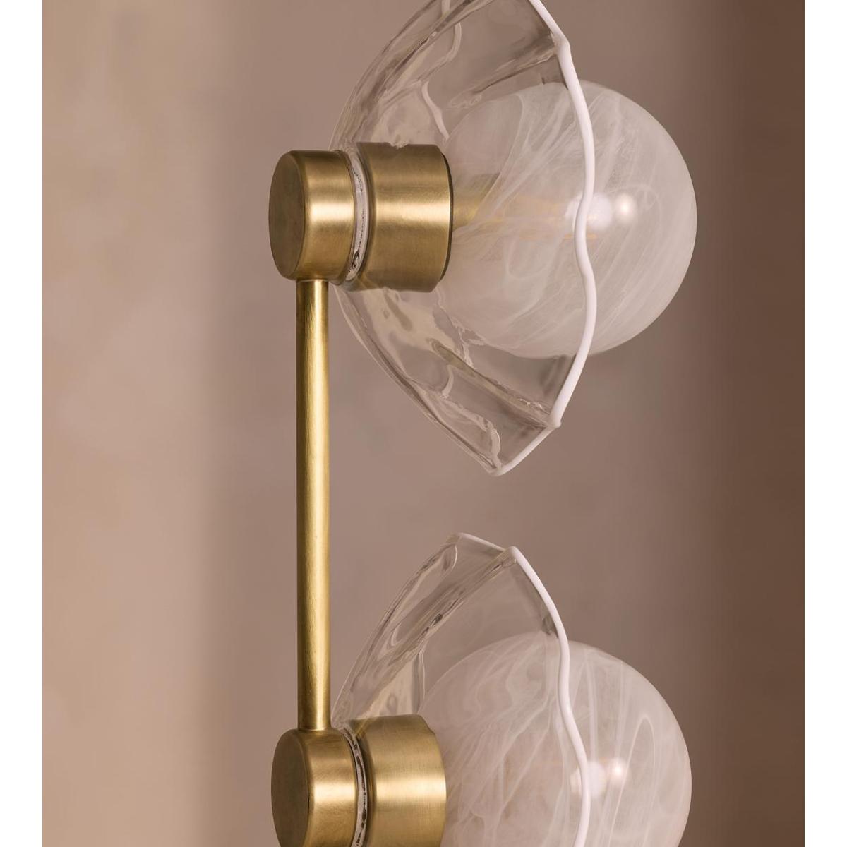 Double-layered glass creates two scalloped bases and orb-shaped bulbs for a statement design. Set on scalloped bases surrounded by contrasting edges, the globe-shaped bulbs of our Holly table lamp are crafted from white swirl glass. Its slender brass stem is secured by a cylindrical base carved from black and white Calacatta Viola marble.