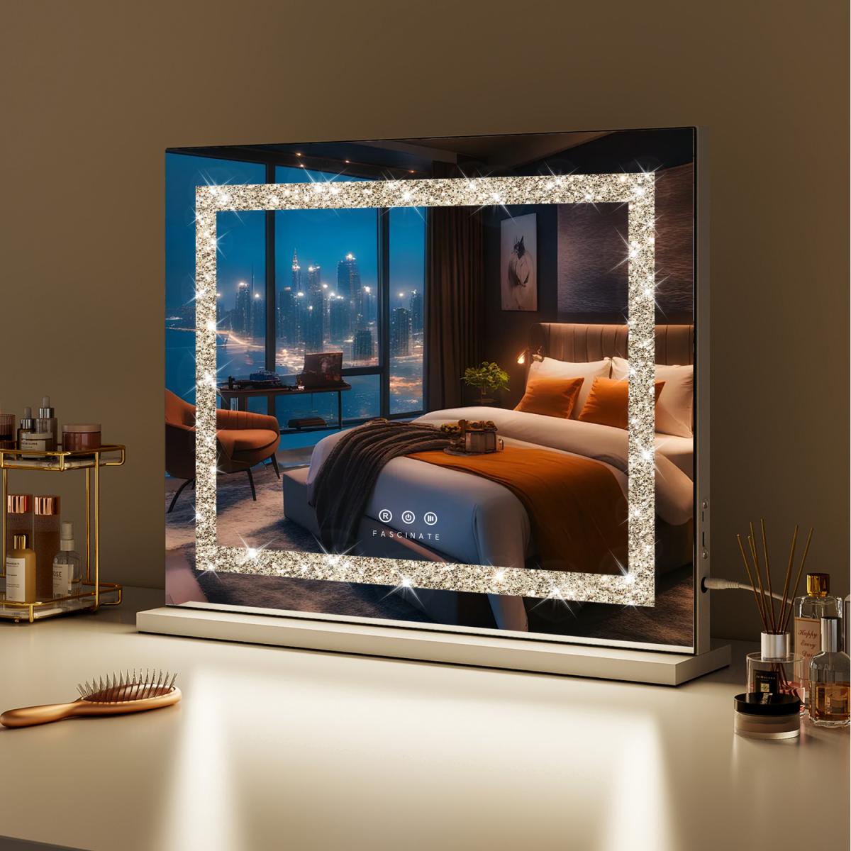 Elevate your daily beauty routine with the FASCINATE Hollywood LED Vanity Mirror. Designed for discerning makeup enthusiasts, this premium mirror boasts bright, dimmable LED lights with three adjustable colour modes (warm, natural, cool) to perfect any look. Enhance your experience with integrated Bluetooth speakers for music or calls and a convenient USB charging port for your devices. Crafted with durable tempered glass and a stunning crushed diamond frame, its versatile design allows for freestanding elegance on your dressing table or secure wall-mounting in your bathroom.