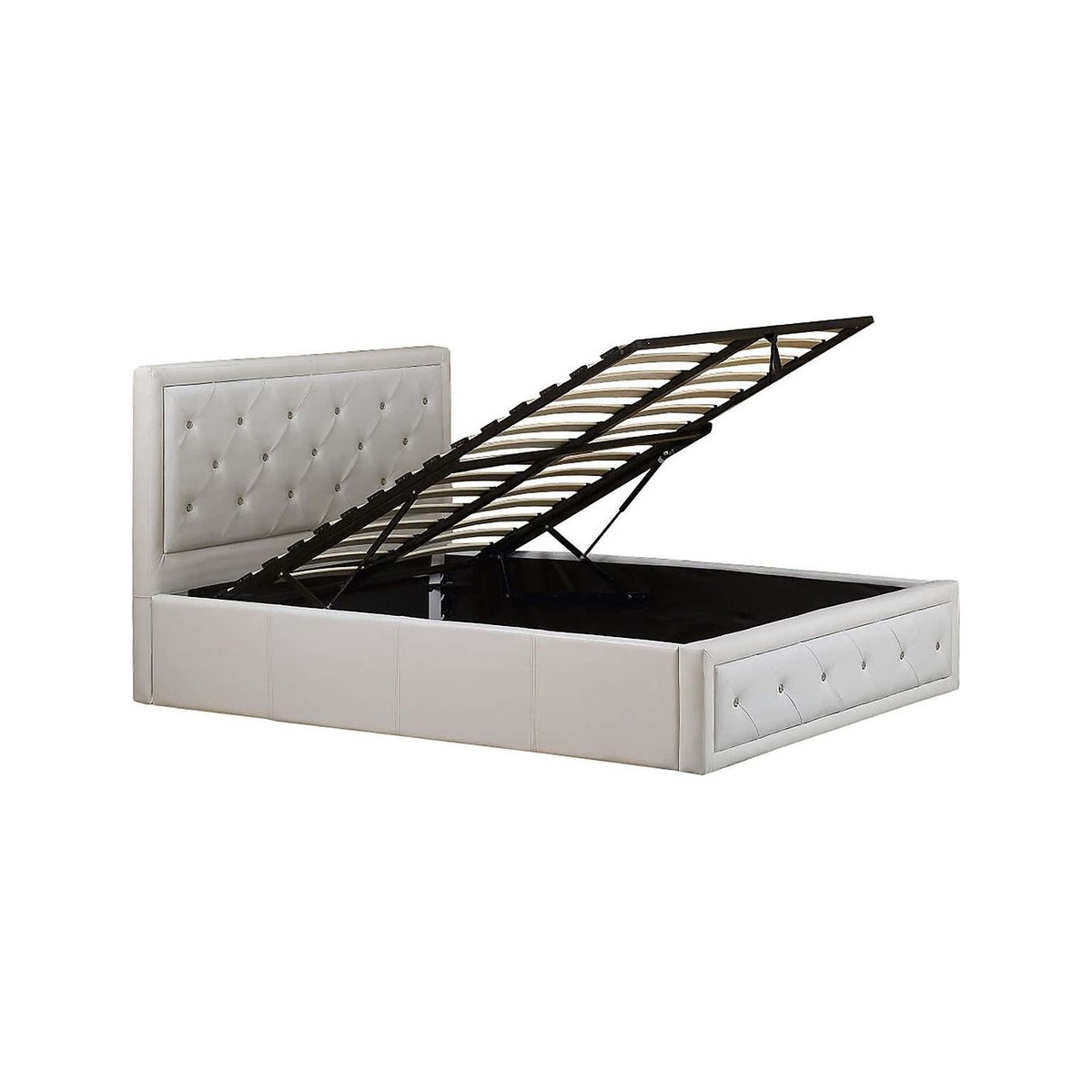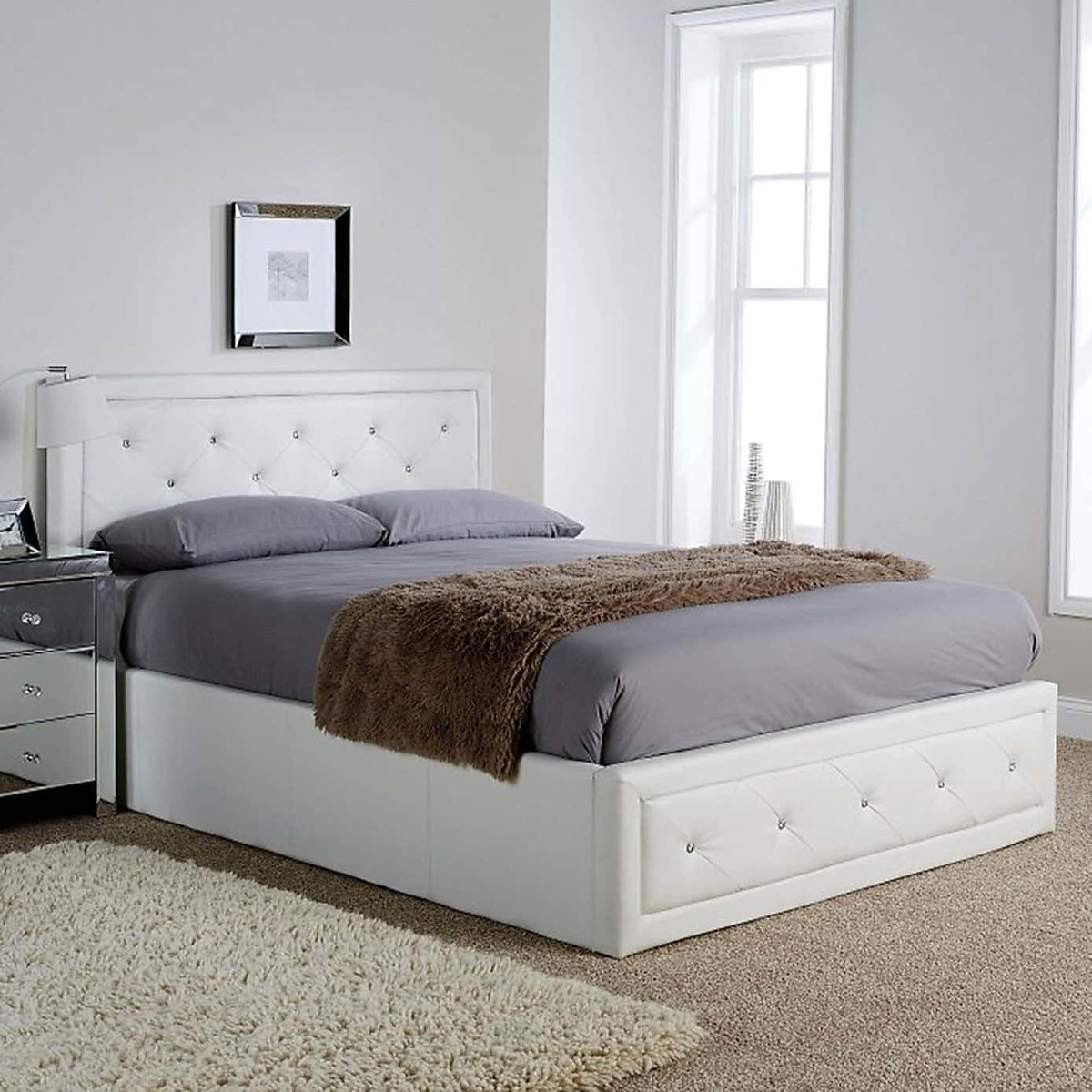 The Hollywood Faux Leather Ottoman Bed boasts a practical gas lift mechanism to reveal plenty of storage space beneath the mattress base. Featuring a tufted headboard and foot end with diamante detailing, this bed frame will suit most décors.
