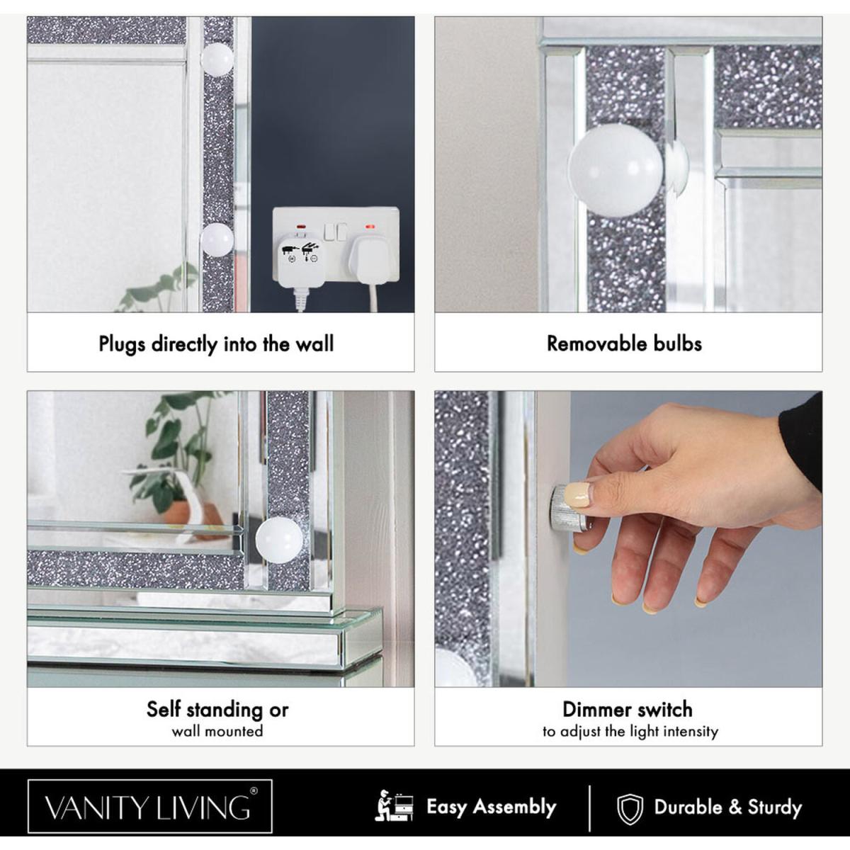 The Broadway 6 light vanity make-up mirror with clear mirror surround is the epitome of dressing room chic. Complete with energy-efficient LED bulbs (E14 screw fitting, 2W energy consumption) and a dimmer switch to adjust the light intensity. (not suitable for bathrooms)