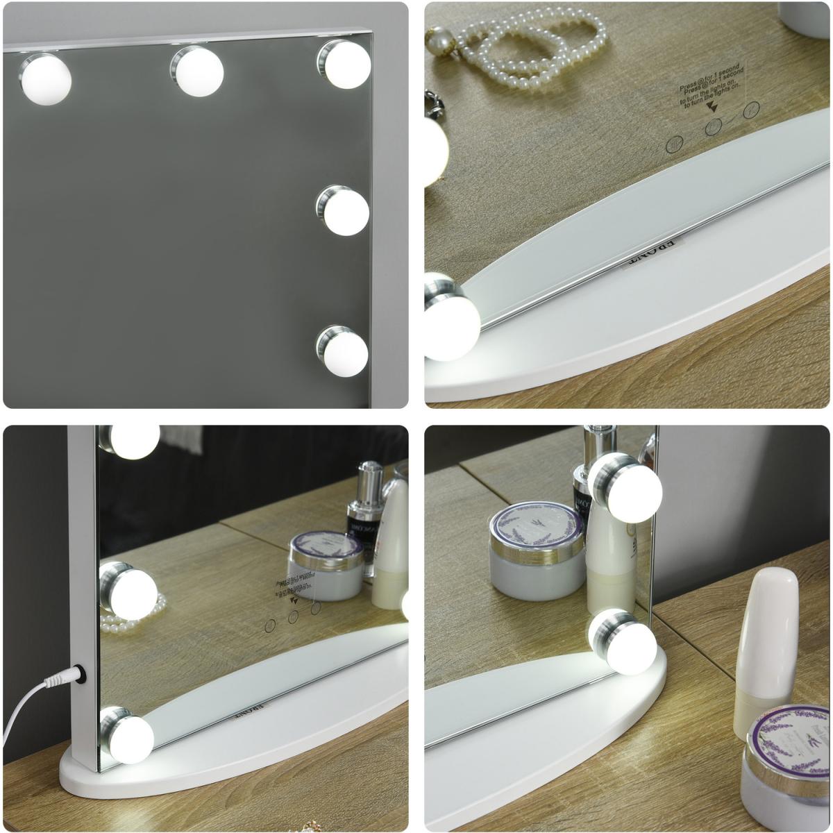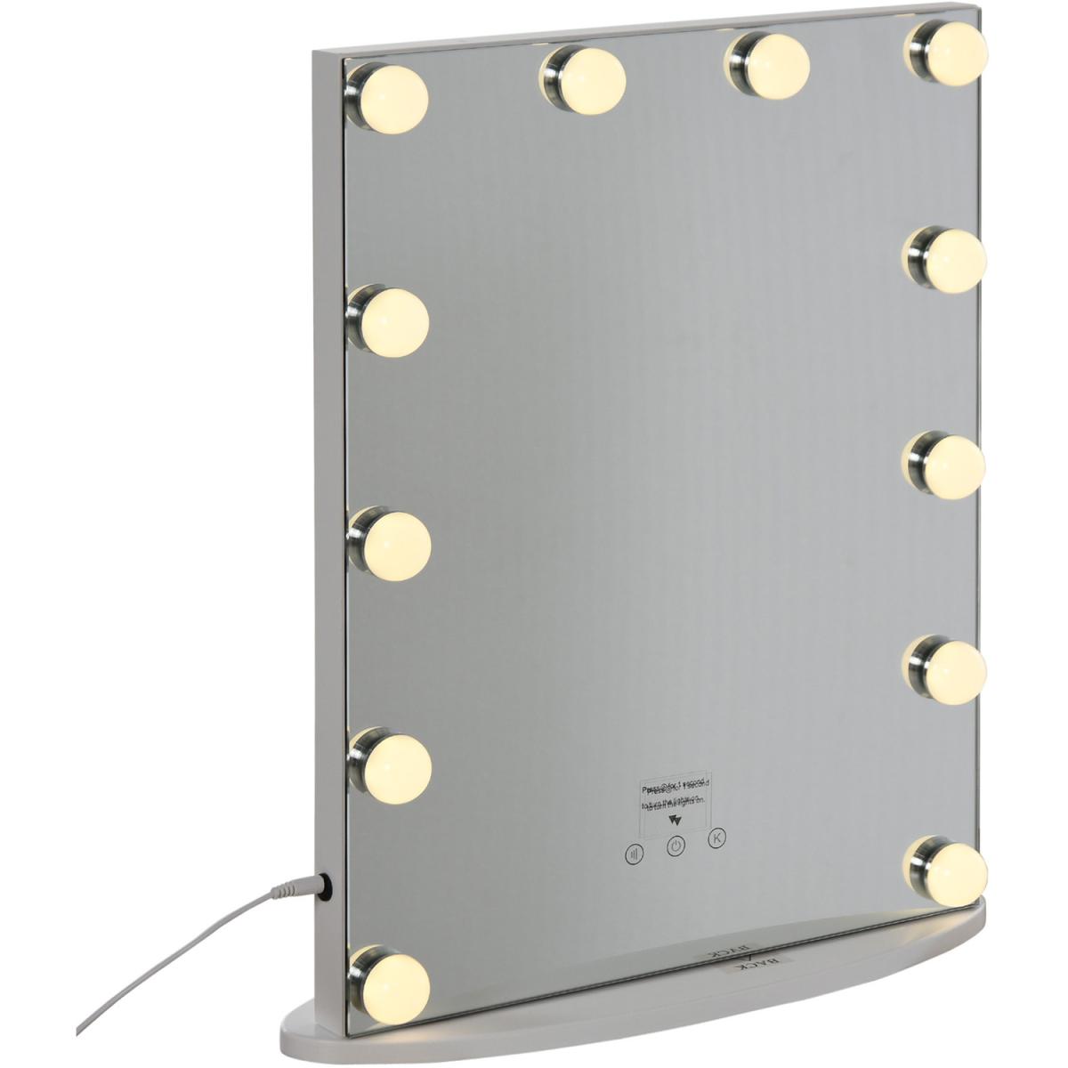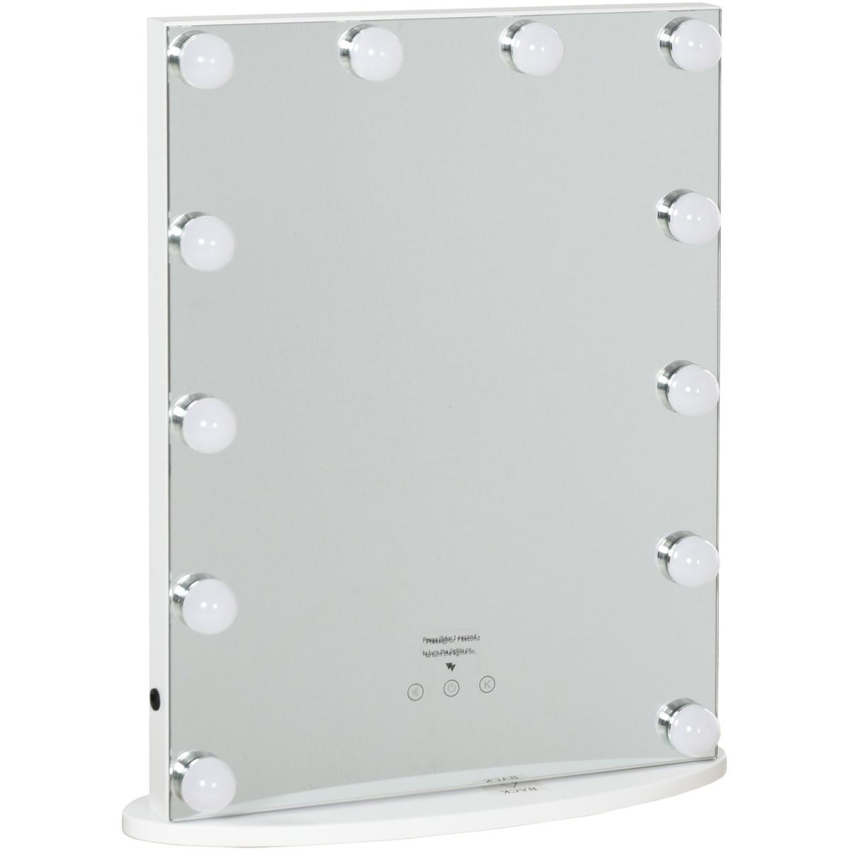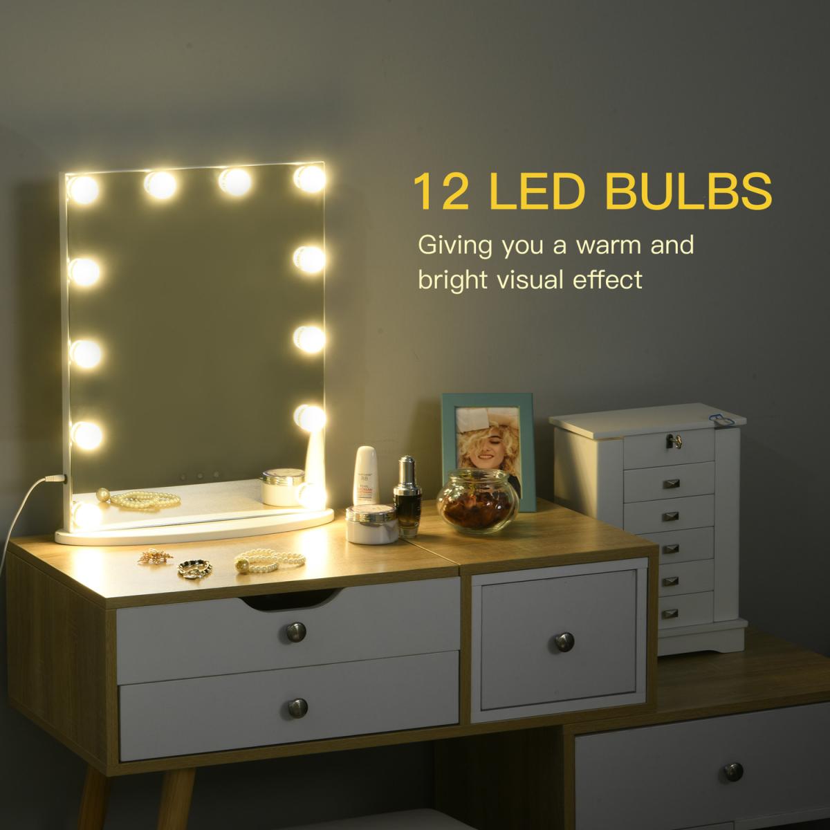 Be the star of your everyday life with this glamorous Hollywood mirror from HOMCOM. This classic design is a must for every bedroom and dressing space - with its large and clear mirror, surrounded by 12 LED bulbs for the perfect amount of illumination to get ready easily with plenty of light. Each bulb is dimmable and can be set to three different shades - warm white, white and cold white - perfect for day and night use. It's fitted on a base to keep it steady and is finished with a small middle button for easy operation. Please note, this mirror is powered by a USB plug which is included.