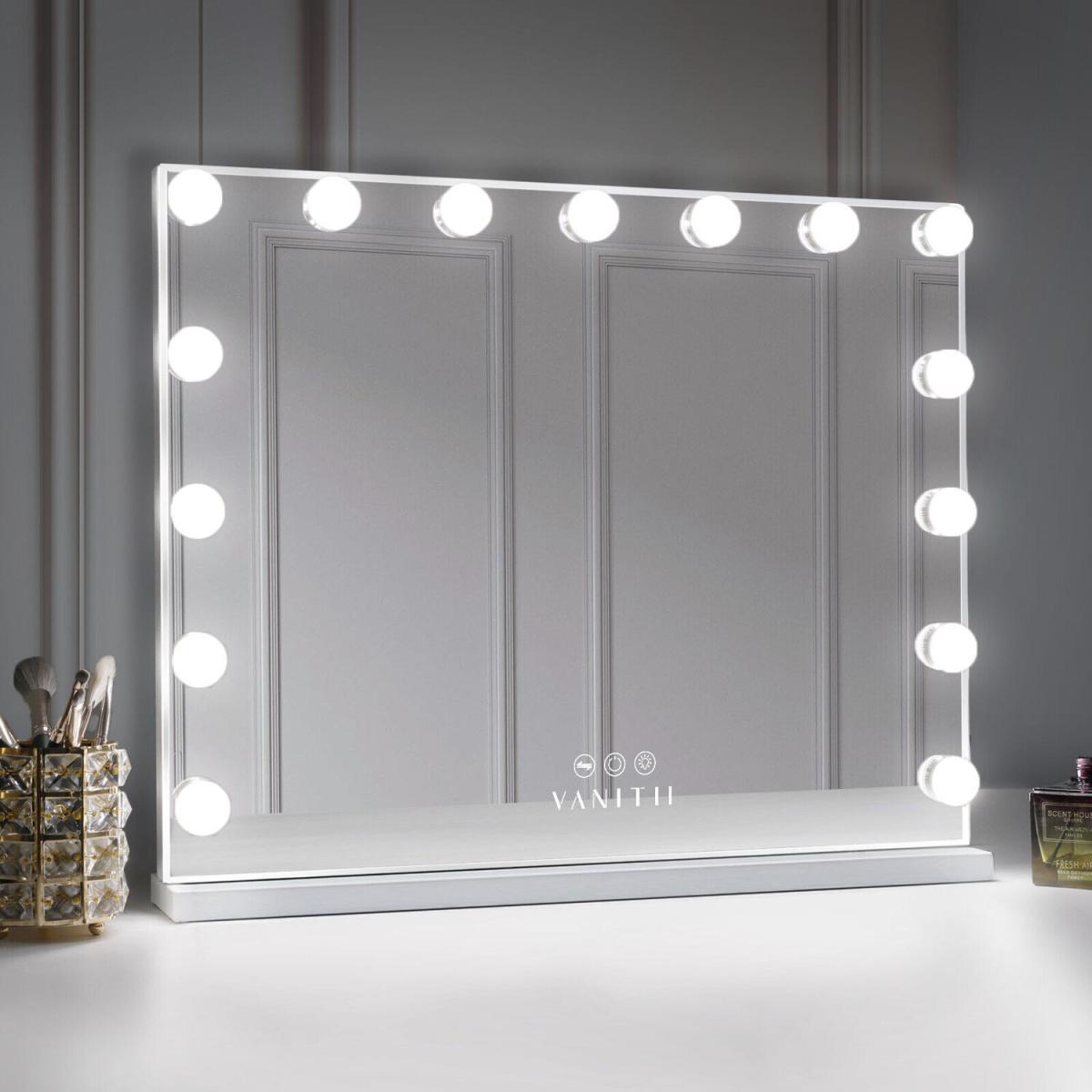 Get the star treatment with our gorgeous VANITII Make-up Mirror. Framed with 15 LED bulbs, this mirror really lights up your countenance during your daily makeup regimen. The aluminium frame is sturdy and lightweight and adds a glistening touch of glamour to the entire mirror. Even more wonderful is that the LED light can be easily adjusted for brightness and colour temperature (choice of cool white, daylight and warm yellow). Turn your bedroom or bathroom into a celebrity set overnight with our make-up mirror. And enjoy beauty in all its illuminated brilliance.