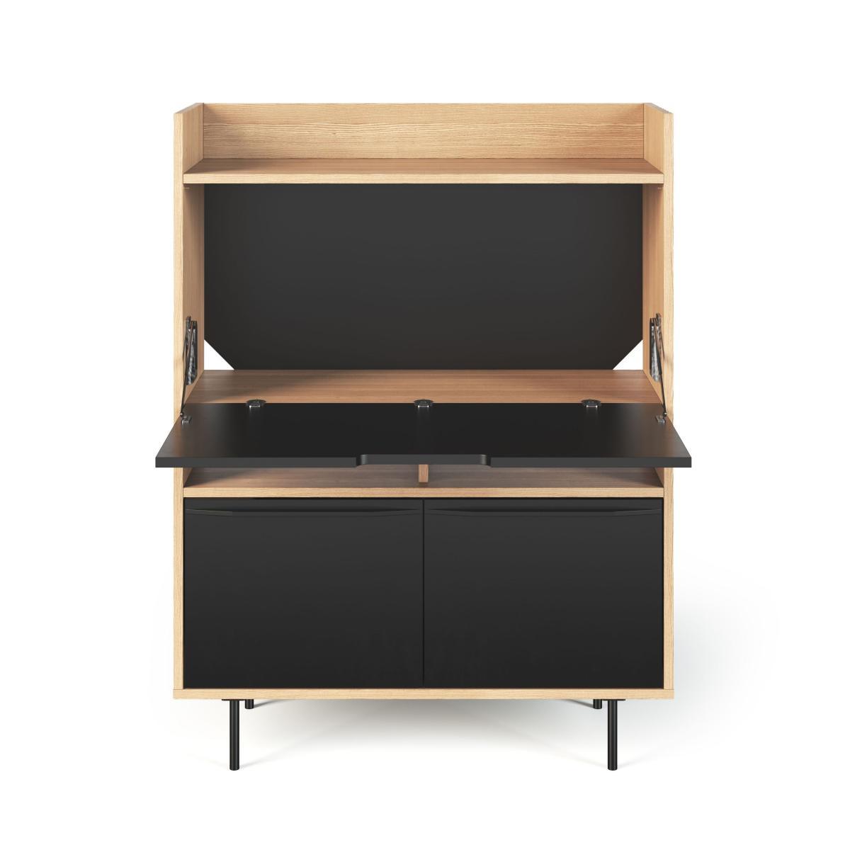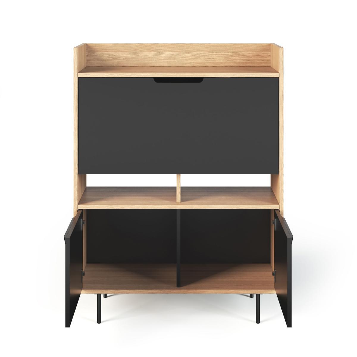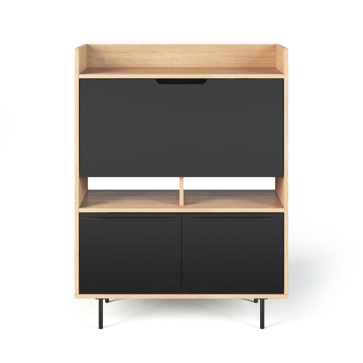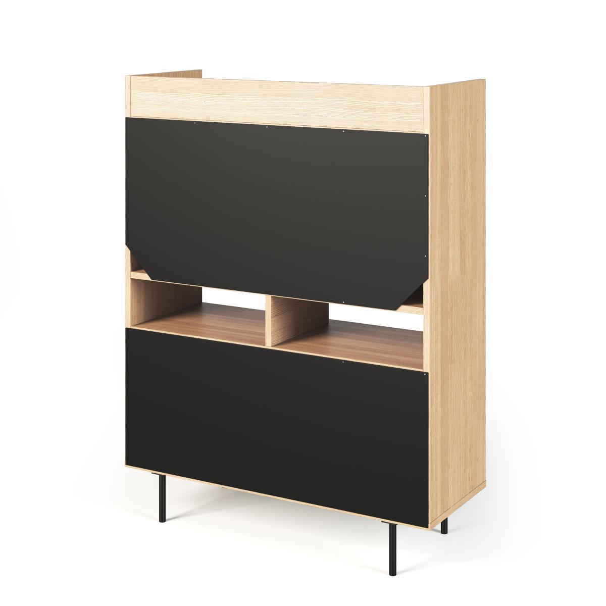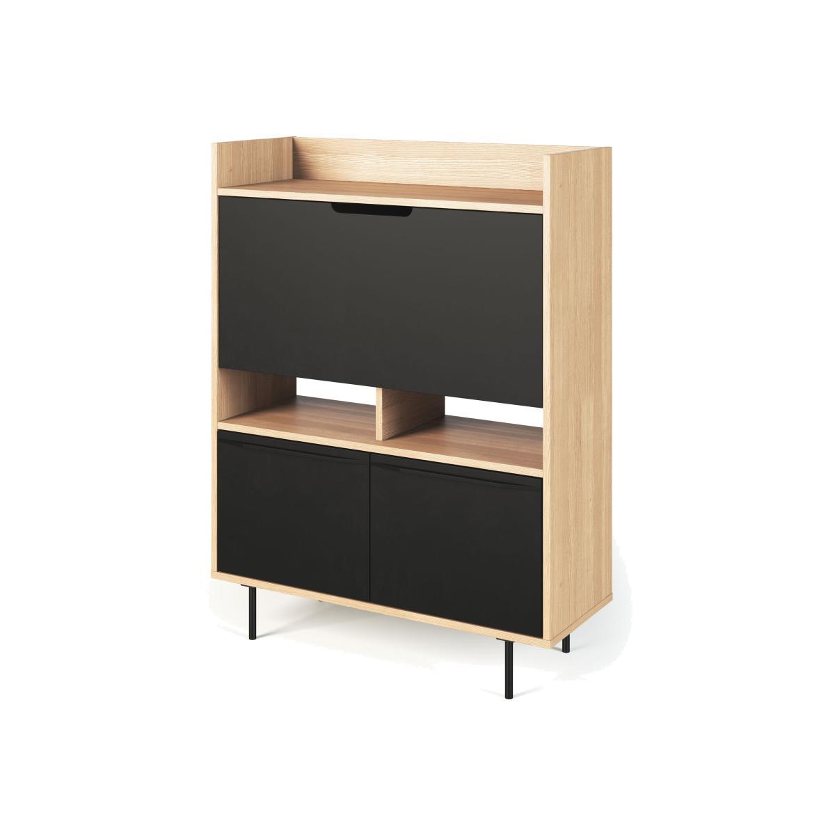 Combining natural oak and black, this refined, contemporary writing desk offers a compact, hidden workspace! The drop-down door lowers to provide a spacious workspace with cable holes. Once the door is closed, your workspace and all your little bits and pieces are hidden away: perfect for the home office. With its compact dimensions, the Holmes writing desk is perfect for small spaces. Ideal for creating an elegant, discreet workspace in a living room, hallway or bedroom. It offers numerous storage possibilities: at the top, a shelf with ledge, and below the workspace, two open compartments. In the lower part, two hinged doors reveal a large storage space with two compartments. The Holmes writing desk is made in Tomar, Portugal. The manufacturing workshop develops technologies with low energy consumption, burns its own wooden offcuts to produce energy, and uses recycled raw materials and packaging… Each POP UP HOME piece of furniture is made up of elements that can be separated at the end of its life for easy recycling. For easy delivery and to reduce the carbon impact, this piece of furniture is delivered as a kit (easy assembly with instructions included).