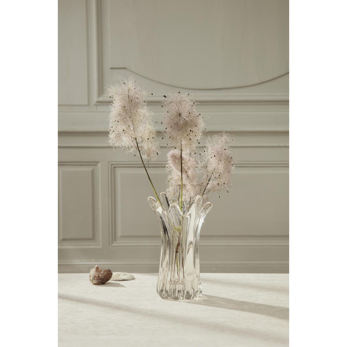 I love this vase’s organic, sculptural shape-it adds a touch of contemporary art to any space. Its transparent, hand-blown glass makes it versatile, working well in both minimalist and eclectic interiors. It’s perfect for displaying fresh blooms or dried arrangements, but it also makes a striking standalone accent on a shelf or coffee table. For styling tips, try pairing it with greenery such as eucalyptus or simple wildflowers for a natural vibe, or leave it empty for a sleek, modern look. Keep in mind its delicate form when handling and place it somewhere secure to highlight its craftsmanship.