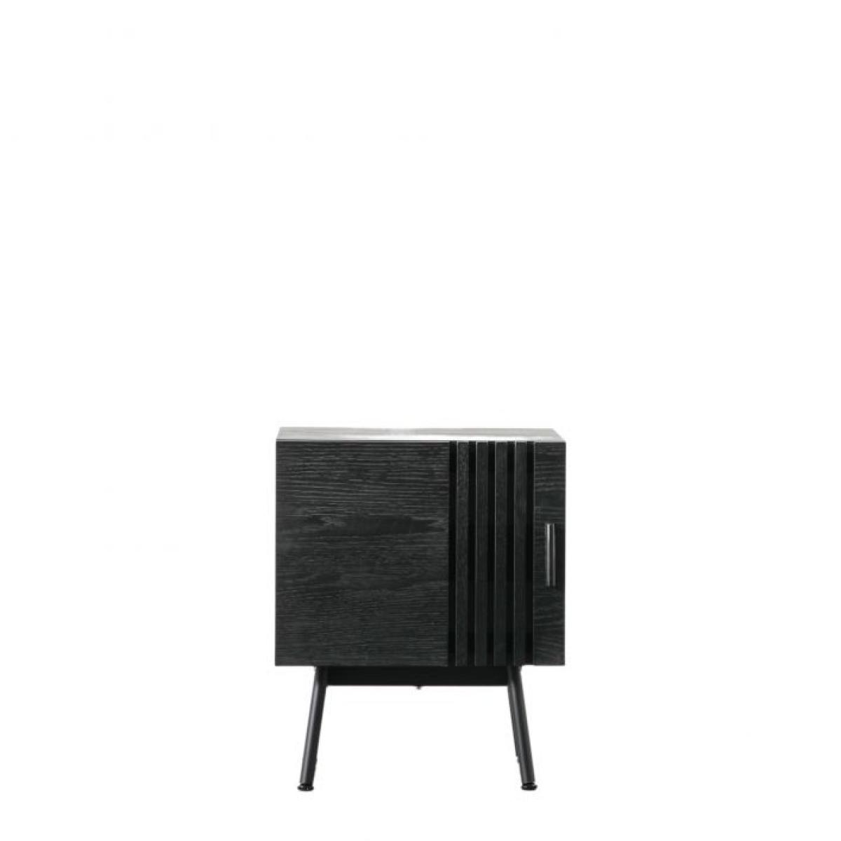 This stunning side table offers a striking contemporary look, with the slatted design on the door adding interest. Crafted using solid oak for the slats and oak veneers, the matt black finish beautifully shows the grain of the wood and pairs perfectly with the matt black metal legs. A matt black solid oak handle adds the finishing touch. The unit is part of a collection which offers a selection of cabinets. The collection is part of our Packed-Flat Design Project, offering easy delivery to any room in any property, whilst reducing the packaging needed. Easy assembly is required, but all the tools needed are supplied.