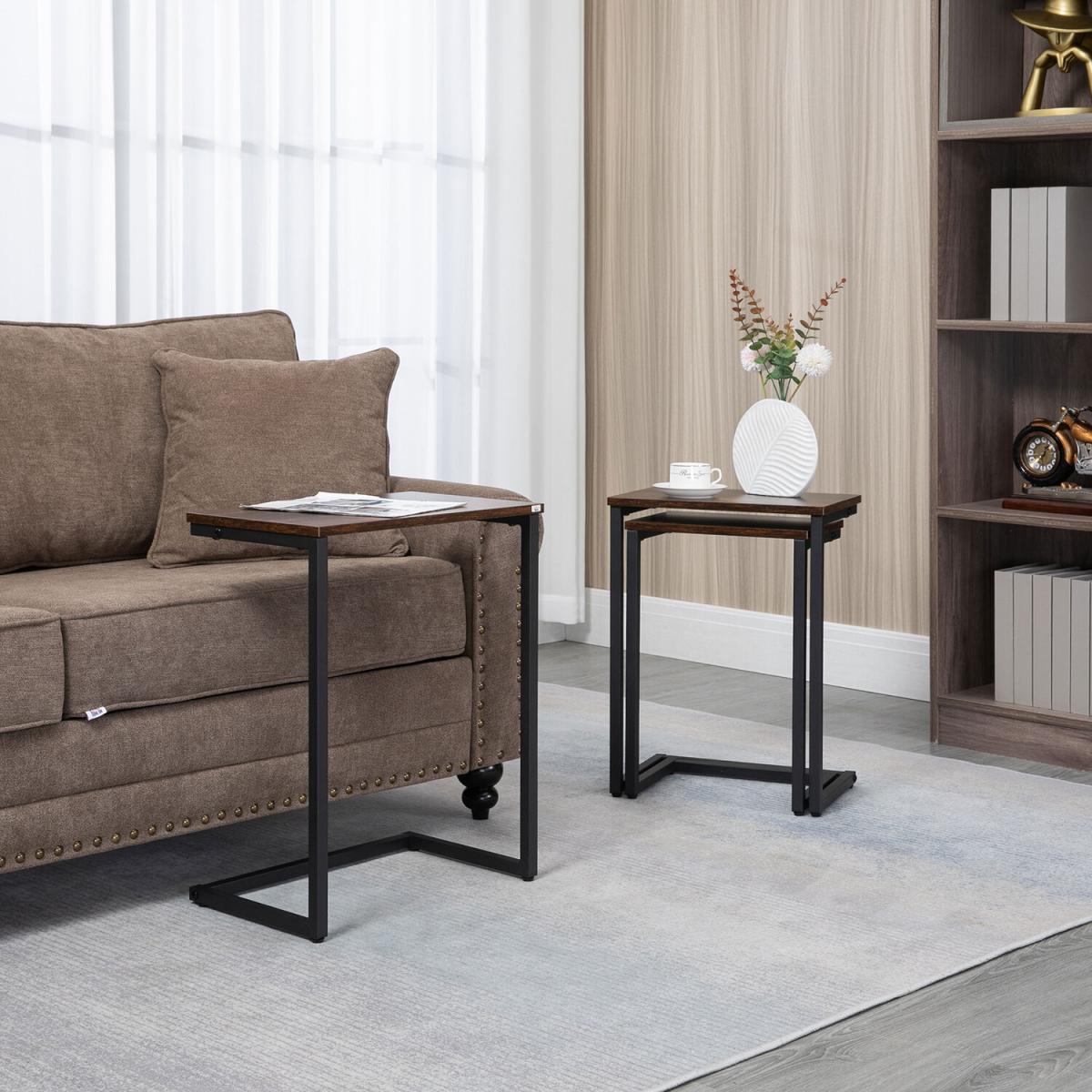 HOMCOM C-Shaped Snack Side Tables with Steel Frame for Sofa Couch - Rustic Brown