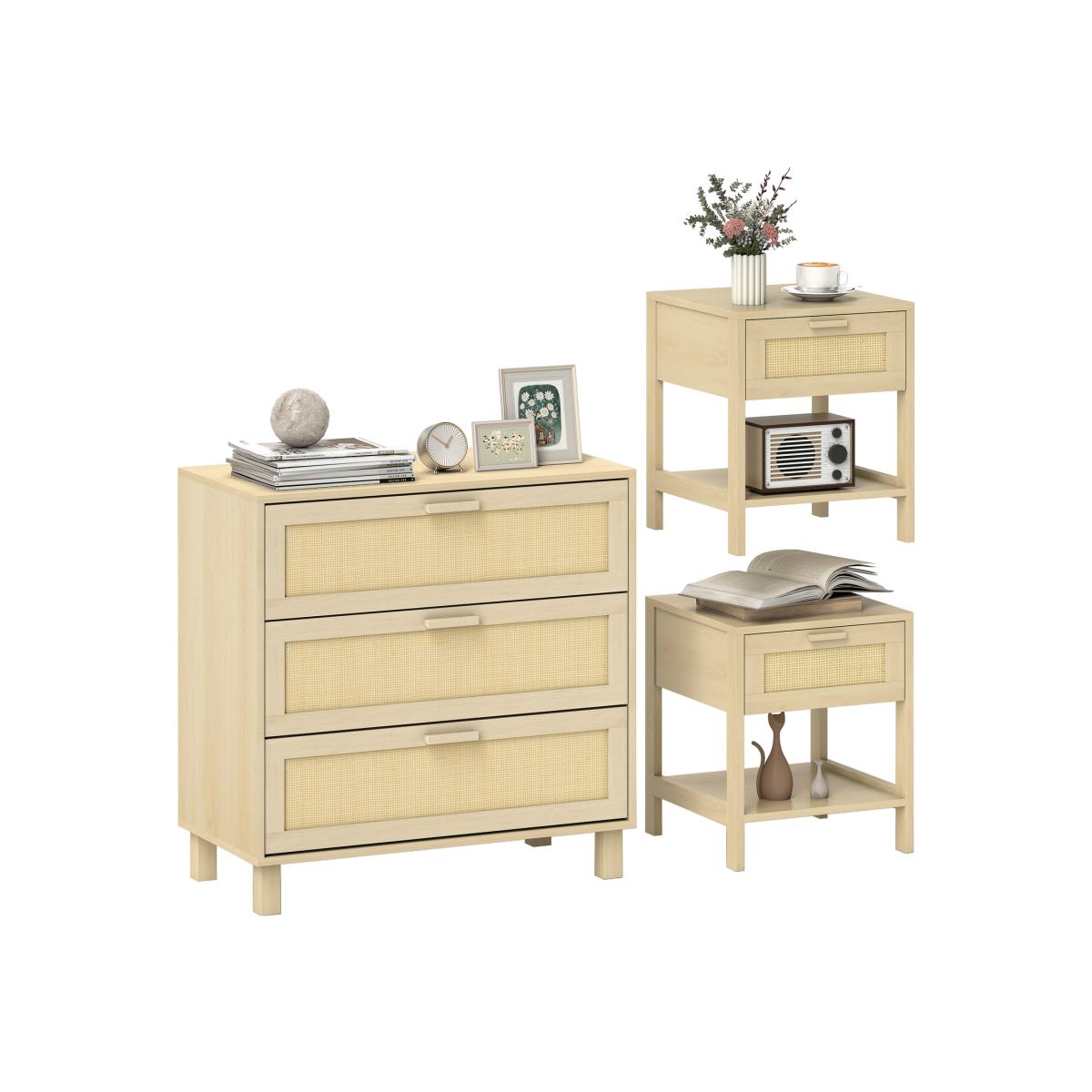 HOMCOM Chest of Drawers and Nightstand, Boho Rattan Furniture Set - Nature Wood Finish