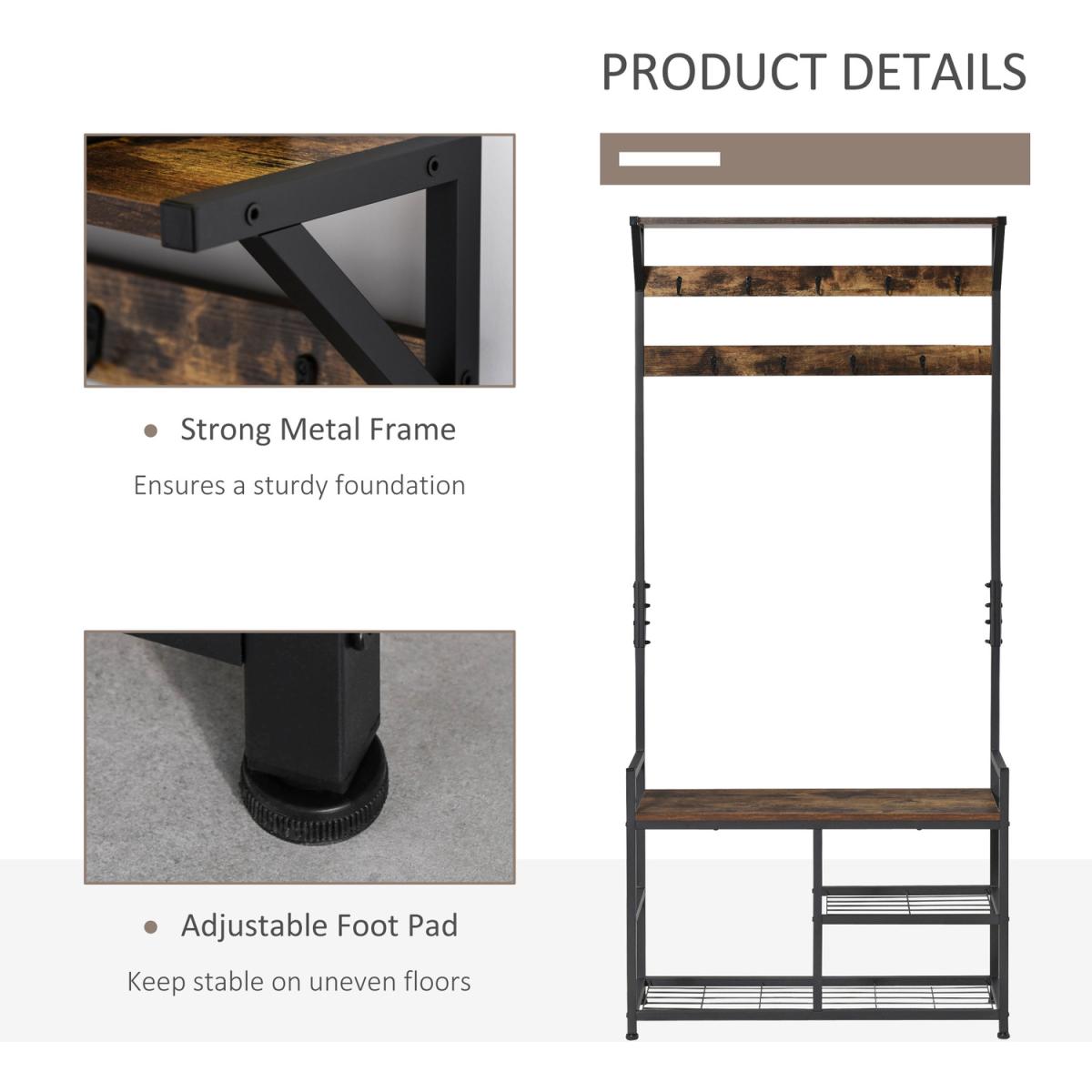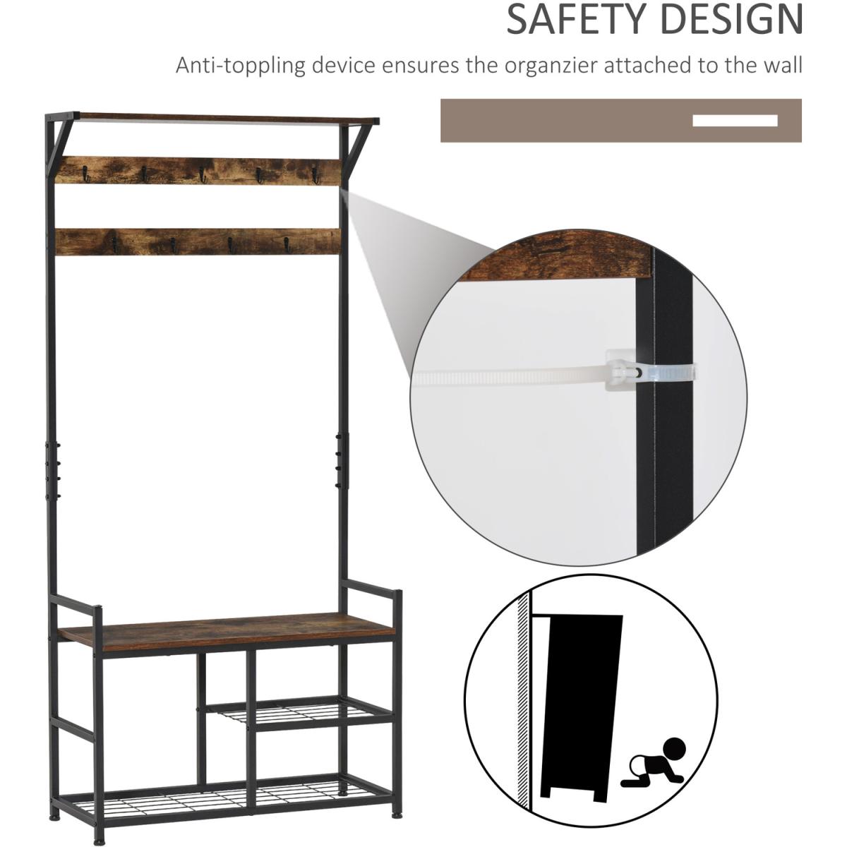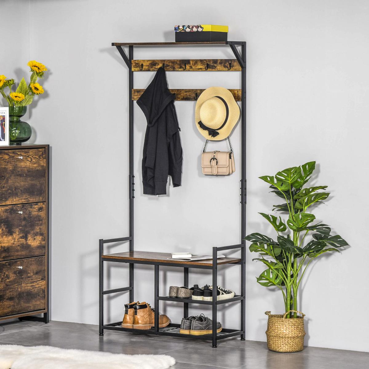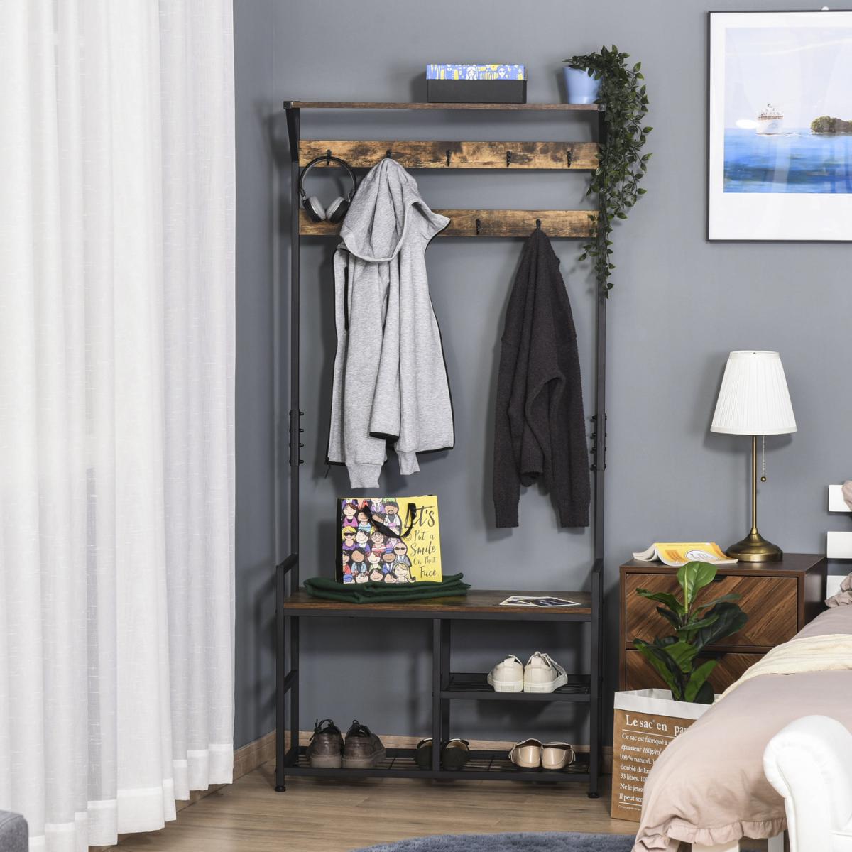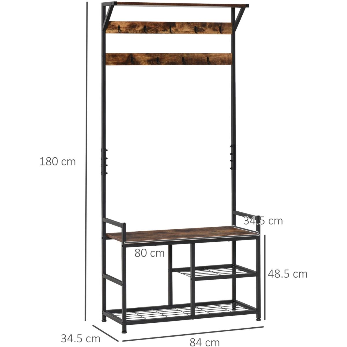 Keep your coats, bags, shoes and small items well organized with our modern coat rack stand from HOMCOM. This organizer with 9 hooks for hanging your coat, 3 shelves total for placing shoes and plant. You can change your shoes while sitting and put your shoes on the bottom shelves. The anti-tilt device on the back ensures it keeps securely in place. Finished in an industrial style, it will work perfectly with many style decors and you will love having it as part of the furniture. It is perfect for any entryway, hallway, living room and bedroom.