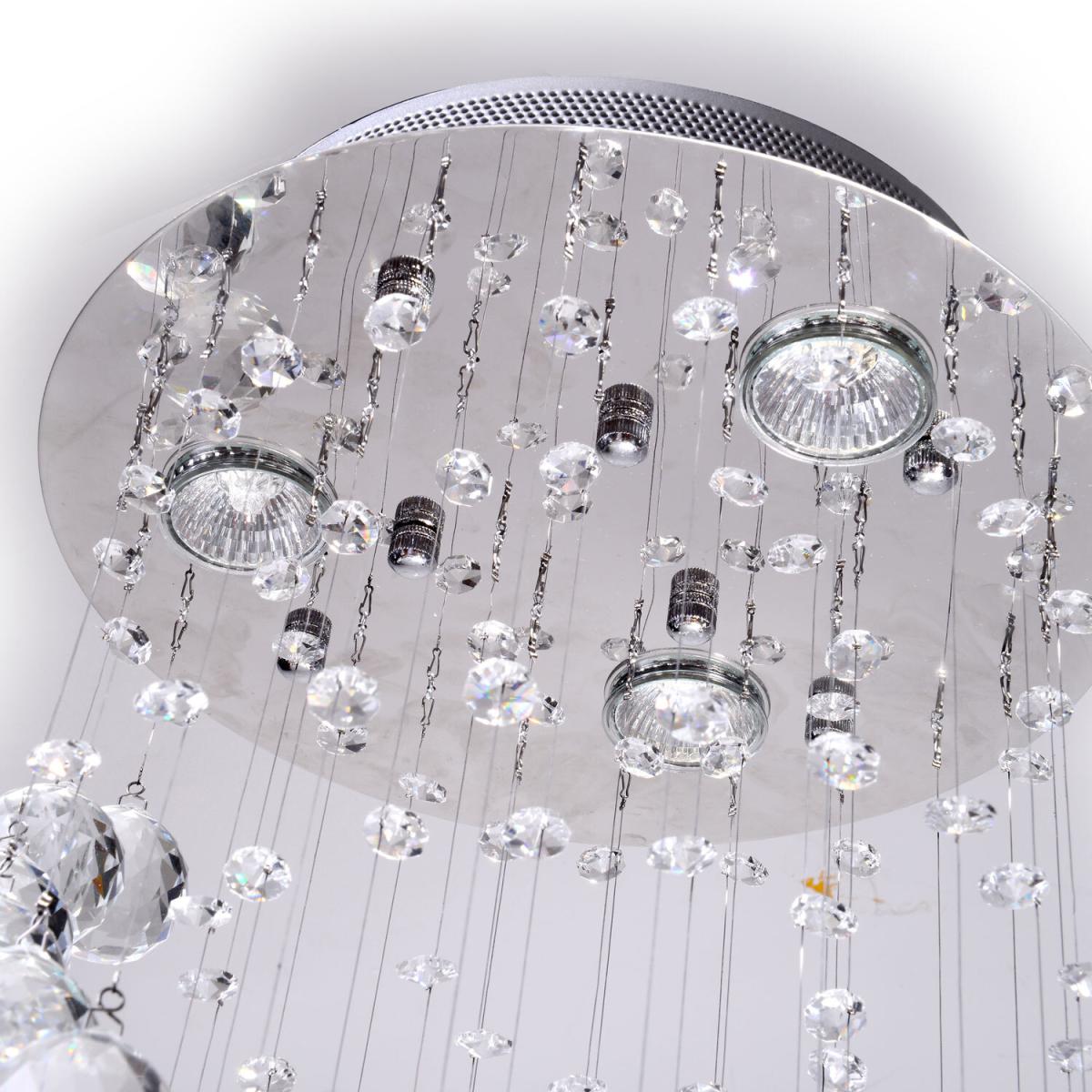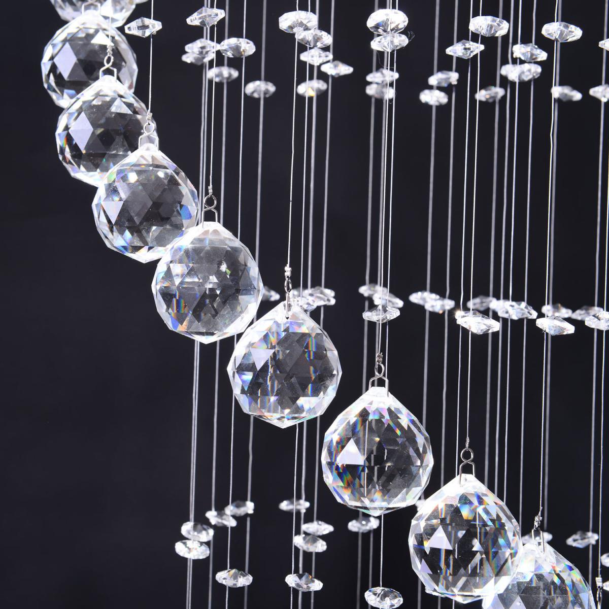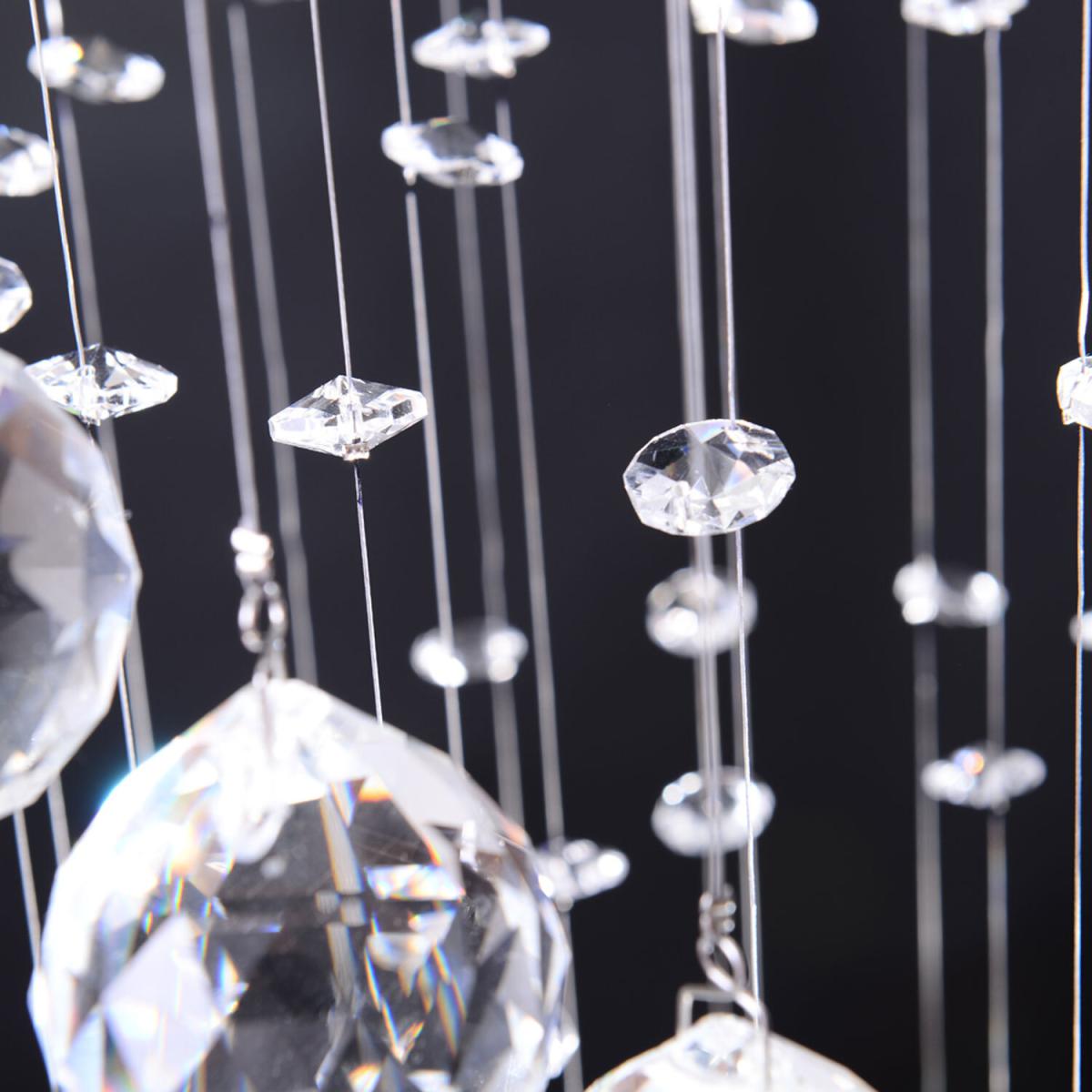 This modern ceiling light chandelier polished in chrome finish features numerous chains of clear glass faceted beads to form an elegant sparkling globe shape. The facets of these balls are polished over a large area, resulting in amplification of the rainbow effect. It is ideal for a lounge, dining room, bedroom or hallway.