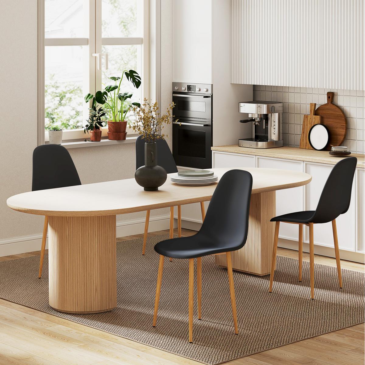 I’m a fan of these black armless dining chairs for their clean lines and slim silhouette - they bring a modern touch without overwhelming a space. The matte seat and warm wood-tone legs strike just the right balance between contemporary and cosy, making them a versatile choice. They work particularly well in Scandi-inspired or minimalist kitchens and dining rooms, but you can also pair them with a rustic-style table for an easy contrast. For a practical touch, add thin seat cushions in a complementary colour or pattern, and tie the look together with a natural-fibre rug underneath your table.