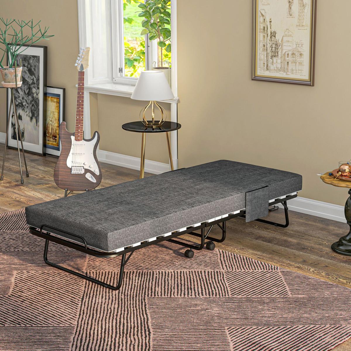 HOMCOM Folding Single Bed with Mattress Lockable Wheels Cover Pockets - Dark Grey