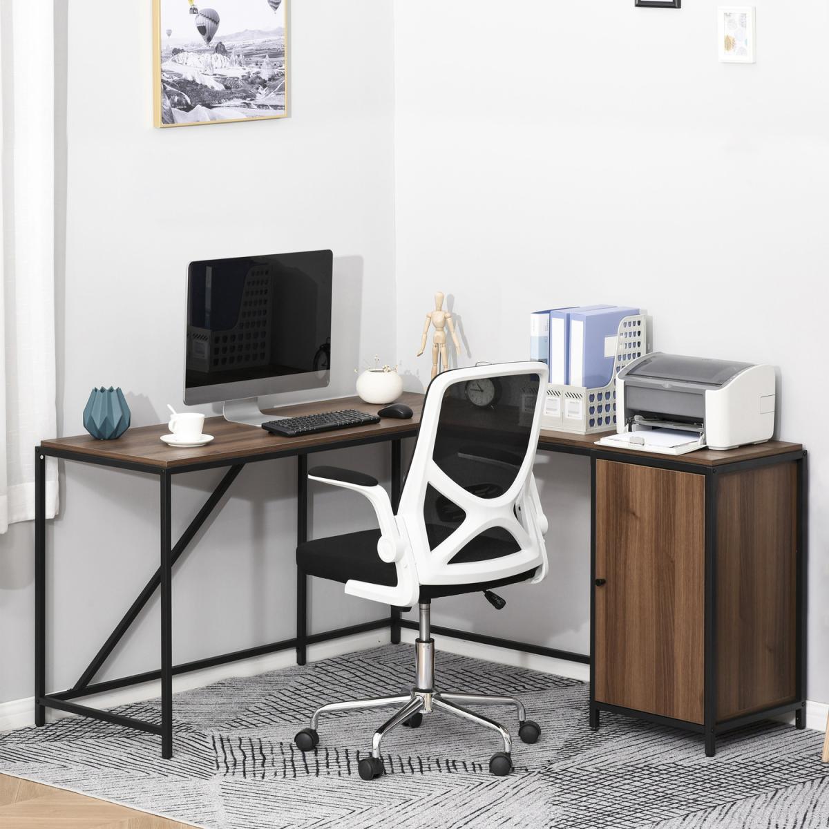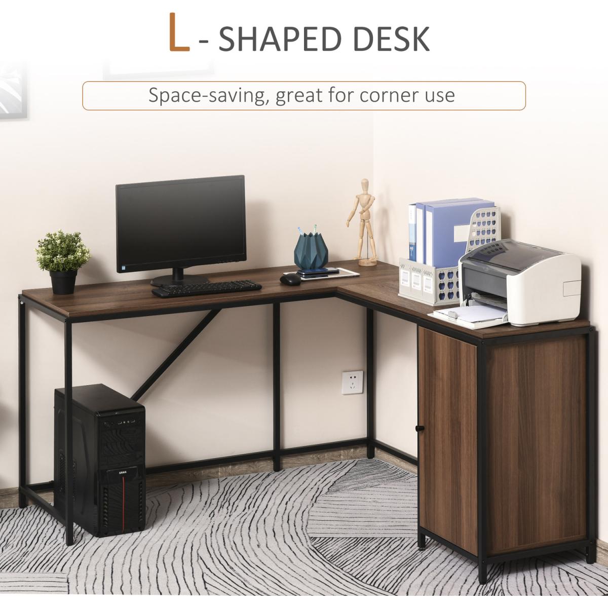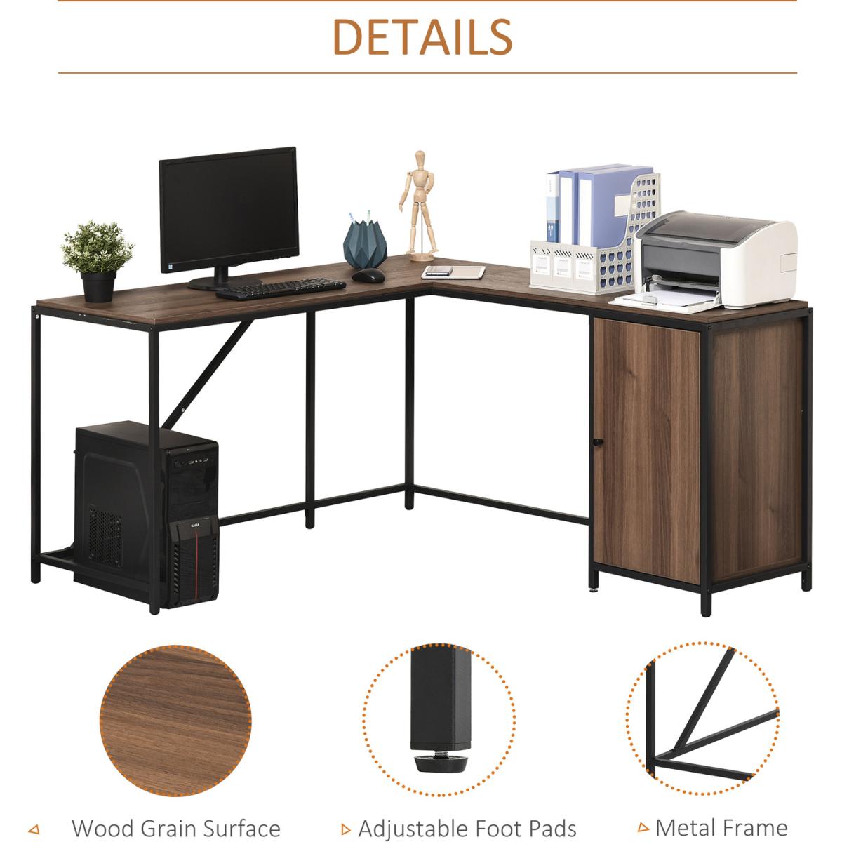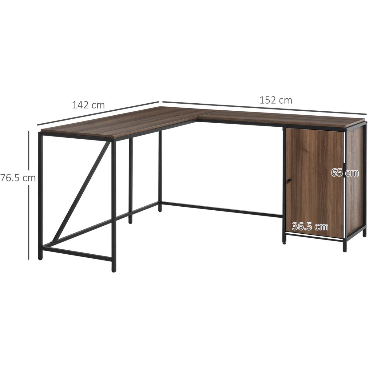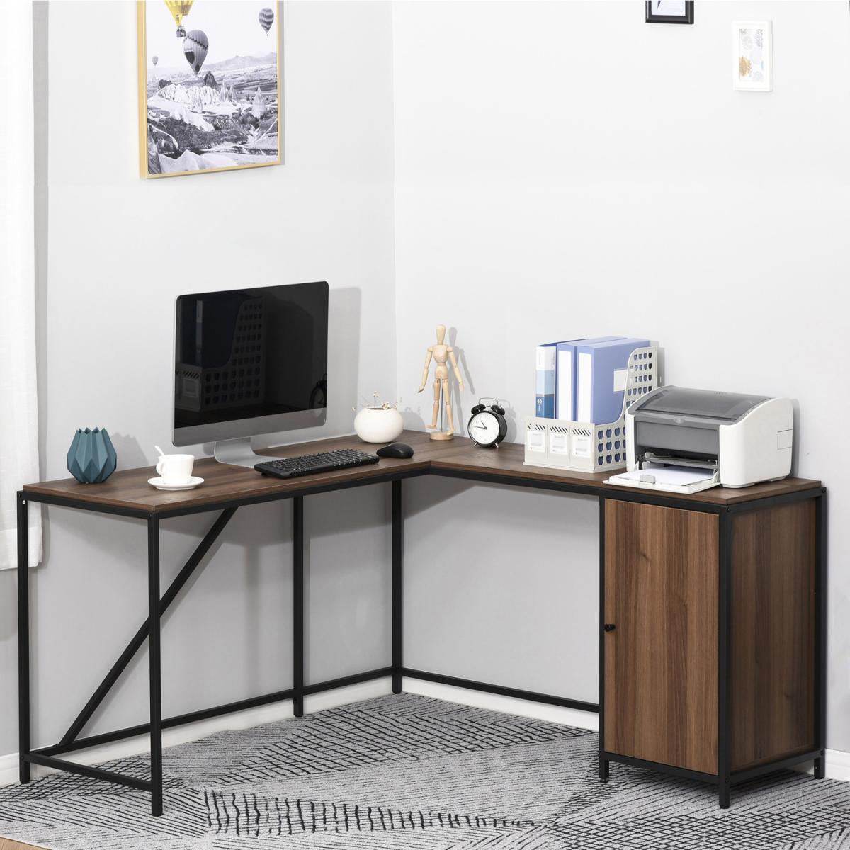 This L-shaped desk combines style and convenience, making it ideal for all home and office spaces. The brown and black minimal design adopts an industrial look which welcomes itself into any space with ease. It features a large work space and a side cabinet, which is fitted with an adjustable shelf, making it easy to store and organise your papers and other work pieces. It's time to create the perfect place to work with this piece from HOMCOM.