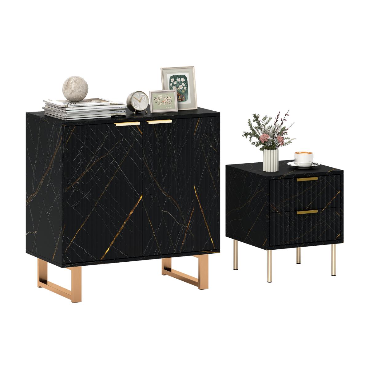 Clutter steals calm mismatched pieces and cramped shelves make evenings feel hectic. Picture a unified space instead the HOMCOM sideboard and nightstand set pairs marble-effect with soft black, framed by Gold Tone accents and hairpin legs for a cohesive lift. Problem solved with storage that adapts an adjustable sideboard shelf for tall platters or small bowls, plus two nightstand drawers. Everything has a place, elevating convenience and everyday comfort.
