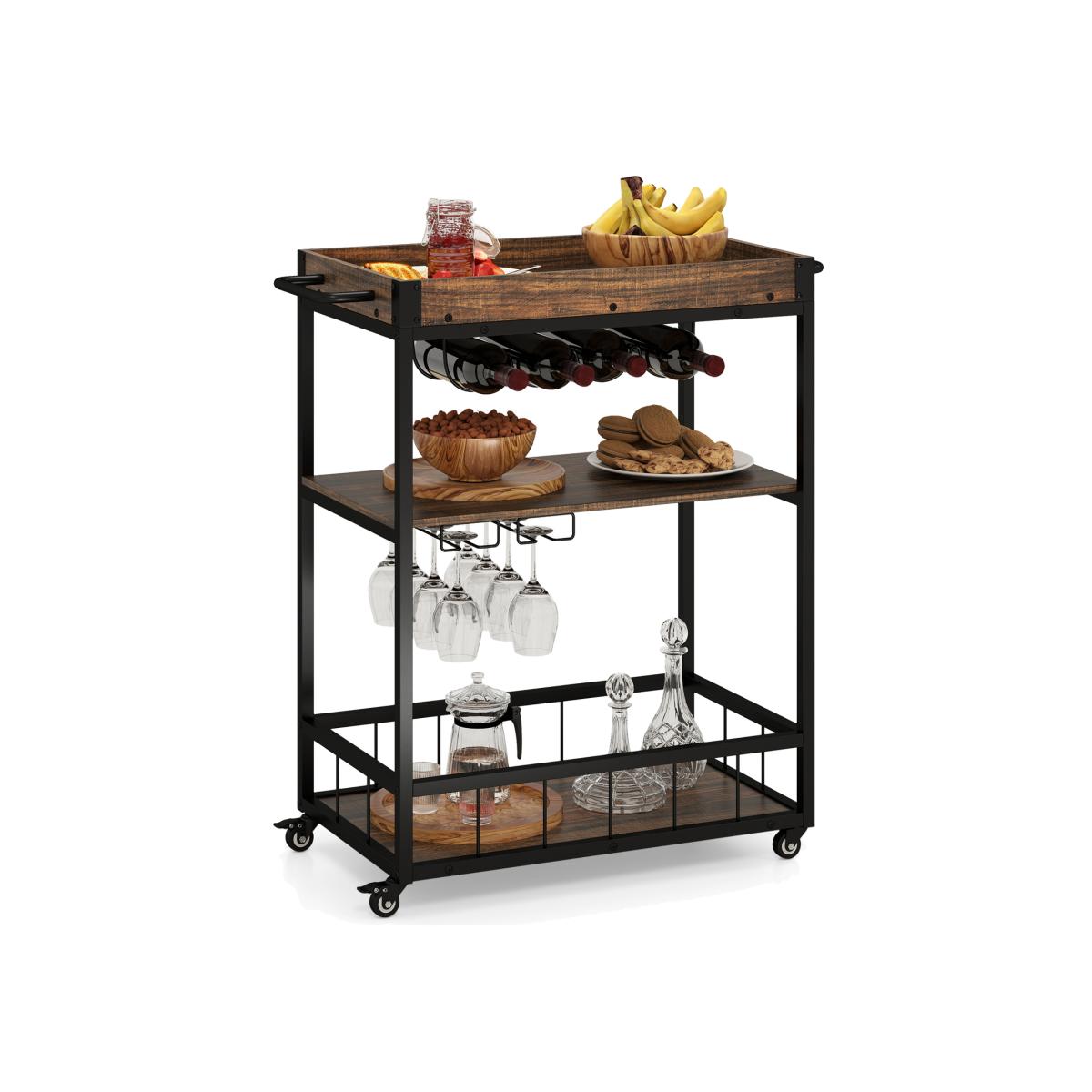 Enhance your space with this versatile rolling bar cart. Featuring a detachable serving tray with secure handles and organized storage for 4 bottles and glassware, this bar cart combines convenience with style. The sturdy MDF and metal frame ensure durability for daily use. You can move effortlessly between rooms with the smooth-rolling casters, blending modern industrial charm seamlessly into any kitchen, dining room, or lounge area.