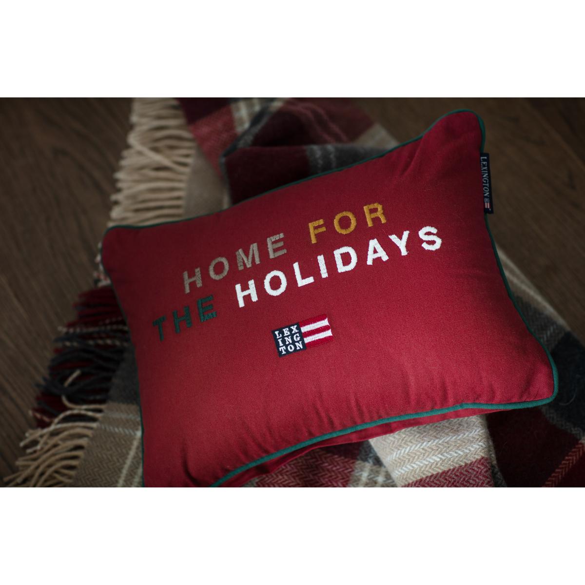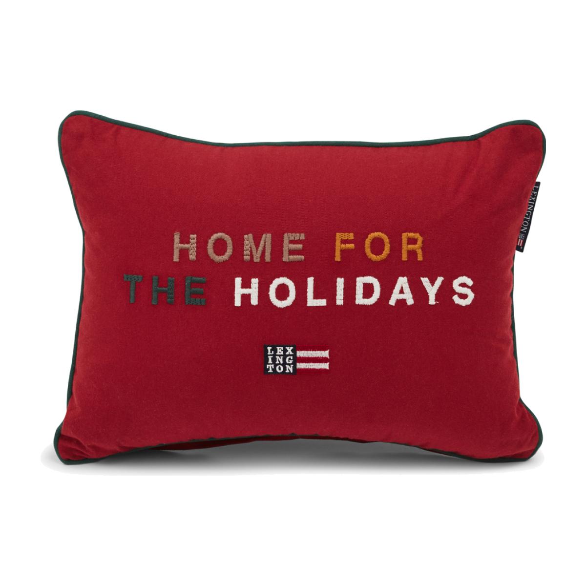 Home for the Holidays pillow 30x40 cm from Swedish Lexington with the text "Home for the Holidays" embroidered on the front is made of organic cotton with a soft inner pillow in recycled polyester. Around the pillow's edges is a matching passpoal. Place the Home for the Holidays pillow on a bed or sofa and use it with other pillows from Lexington's lovely assortment.