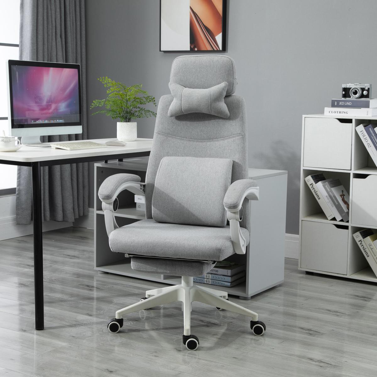 Making playing or working all day long effortlessly comfortable, thanks to this office chair from Vinsetto. Its ergonomic design is formed of a curved and adjustable back, manual extending footrest and thick padding all over. A large headrest is perfect for when leaning back, and the five wheels allow smooth movement whilst seated. It's finished with fabric upholstery for a forever-stylish look and also comes with a large back pillow and a small neck pillow. A great way to transform your everyday work life.