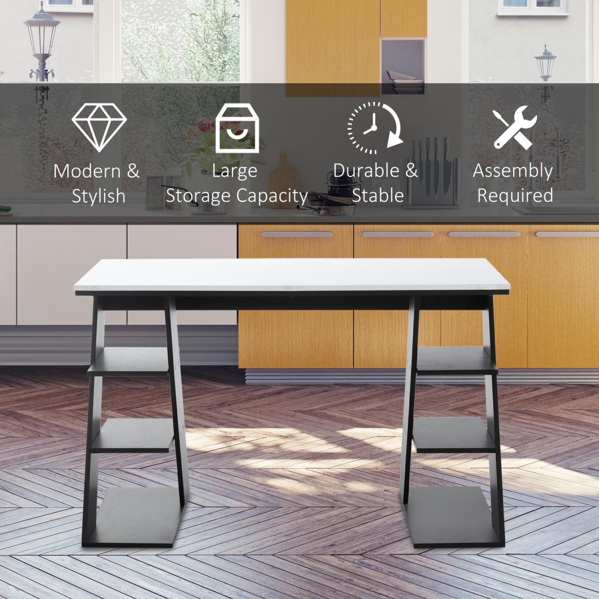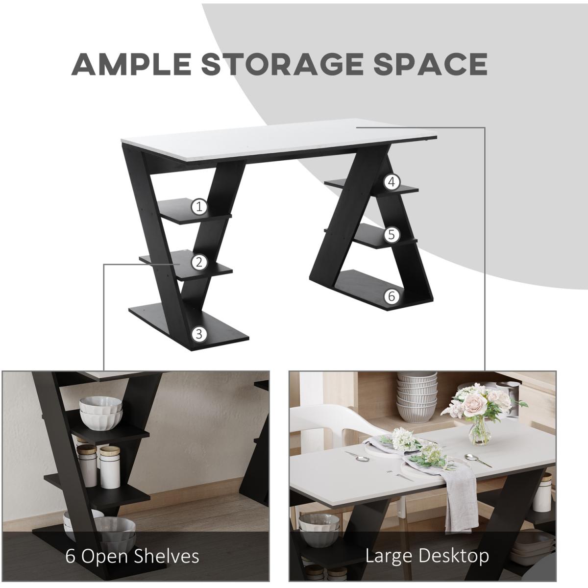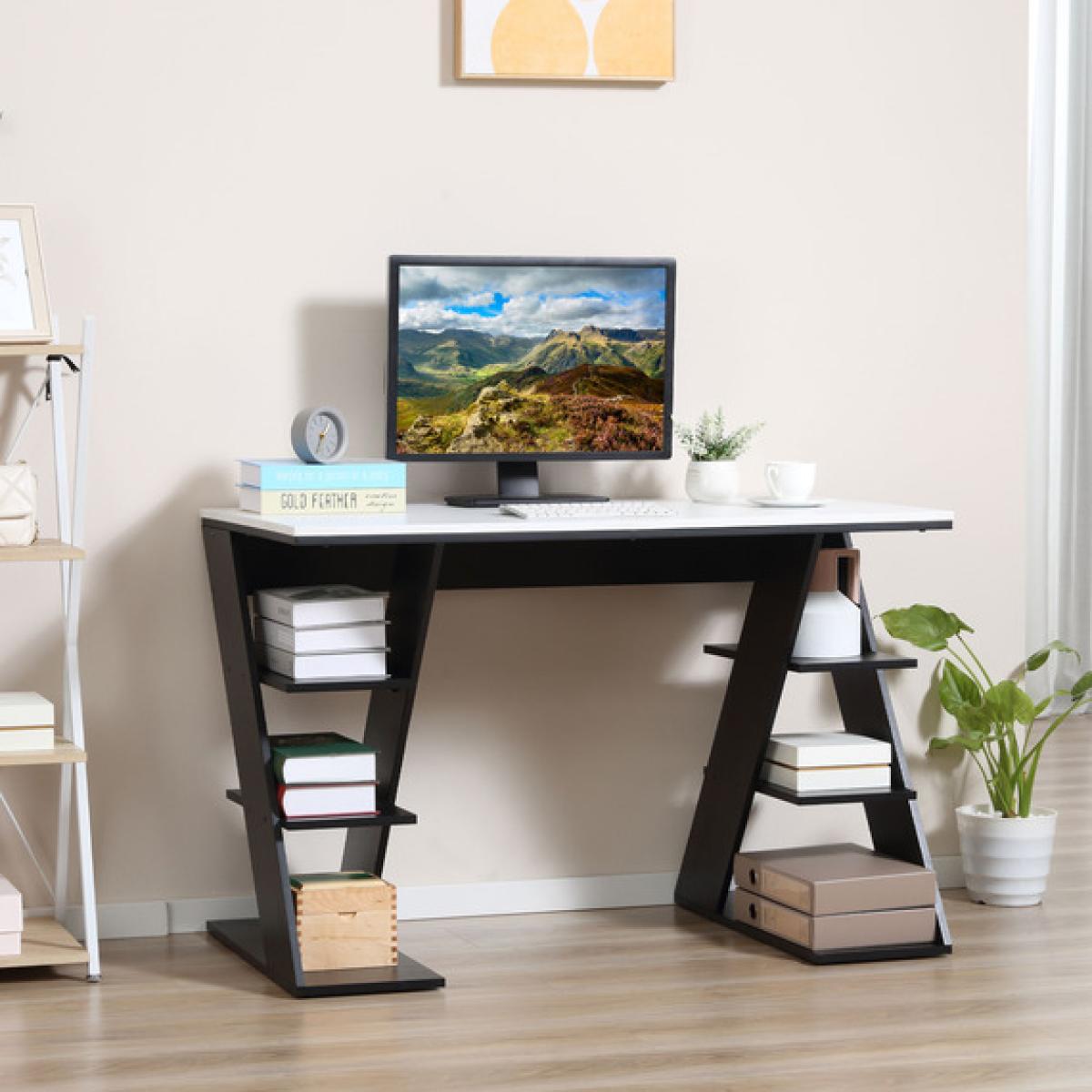 Black and white color scheme and with the chic shaped legs make the laptop workstation a great addition to your study, office and dorm. Combines a spacious desktop and 6 open shelves to meet both your working and storage needs. Besides, it has plenty of legrooms for rest and your comfort. This multifunctional writing desk will bring you a comfortable experience in intense and efficient work. You can put your daily items on it with its 30kg weight capacity.