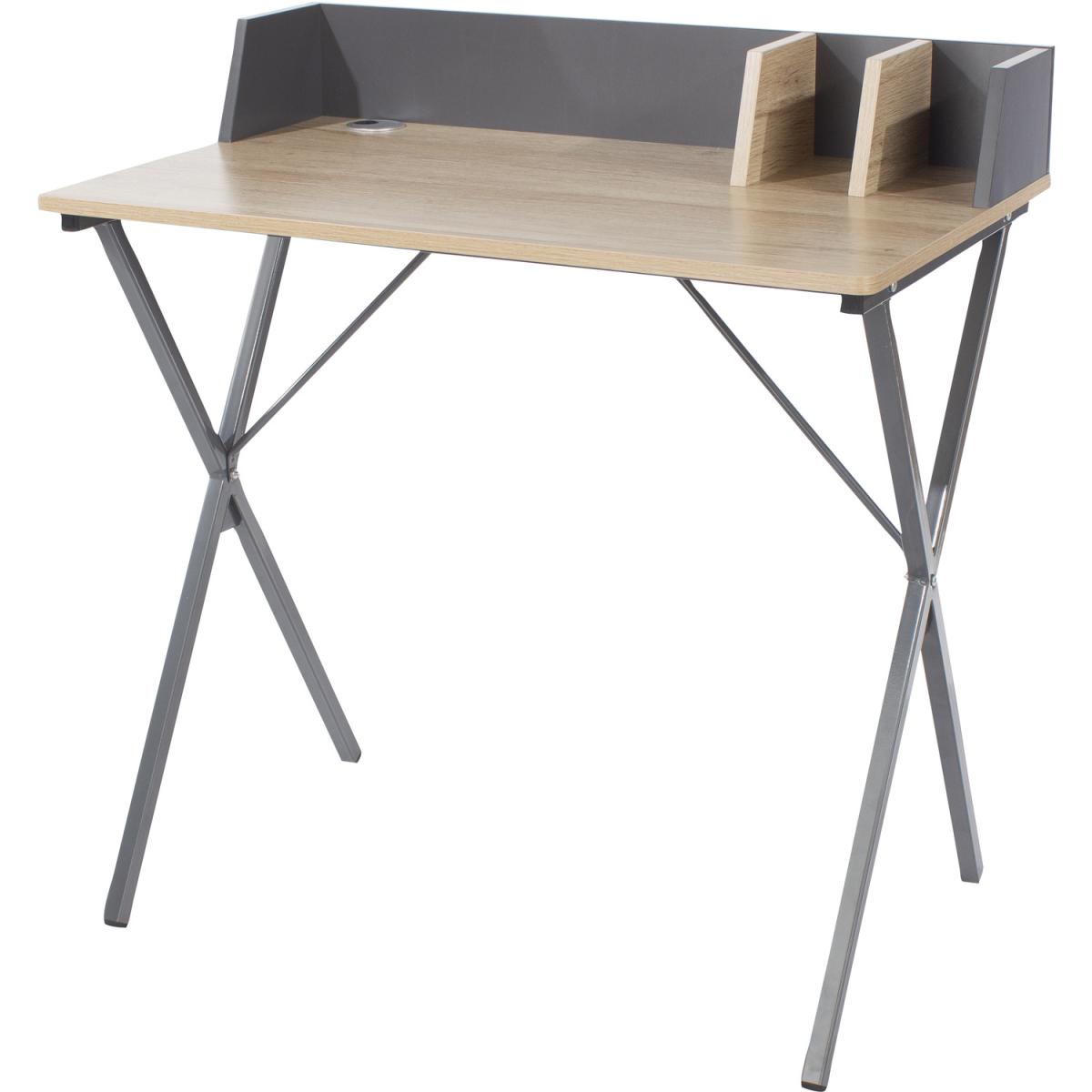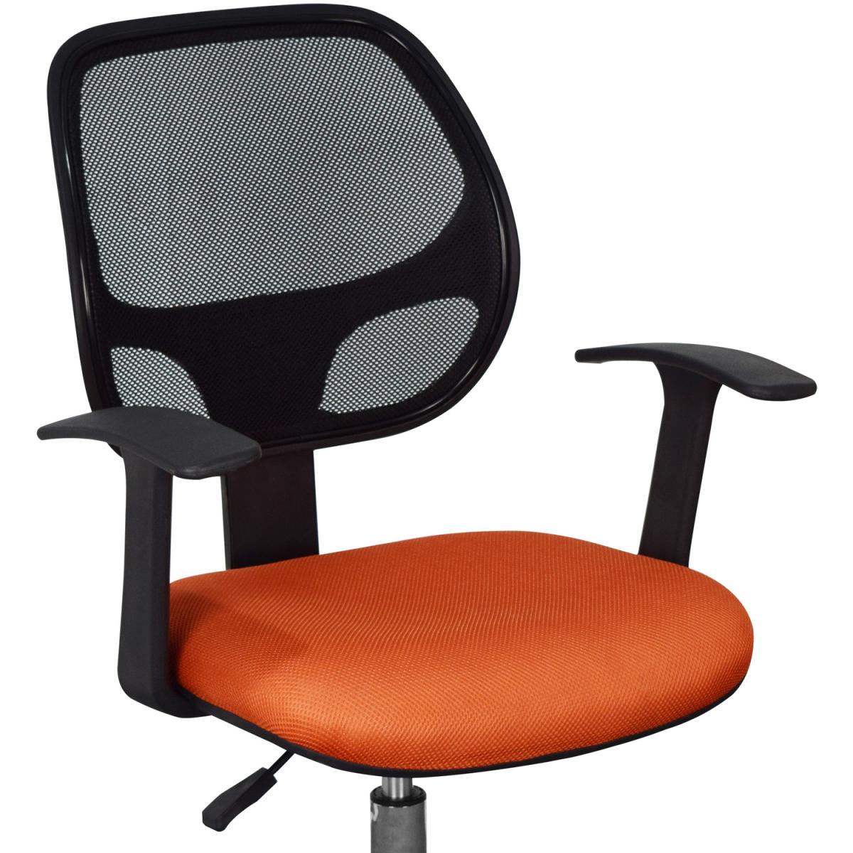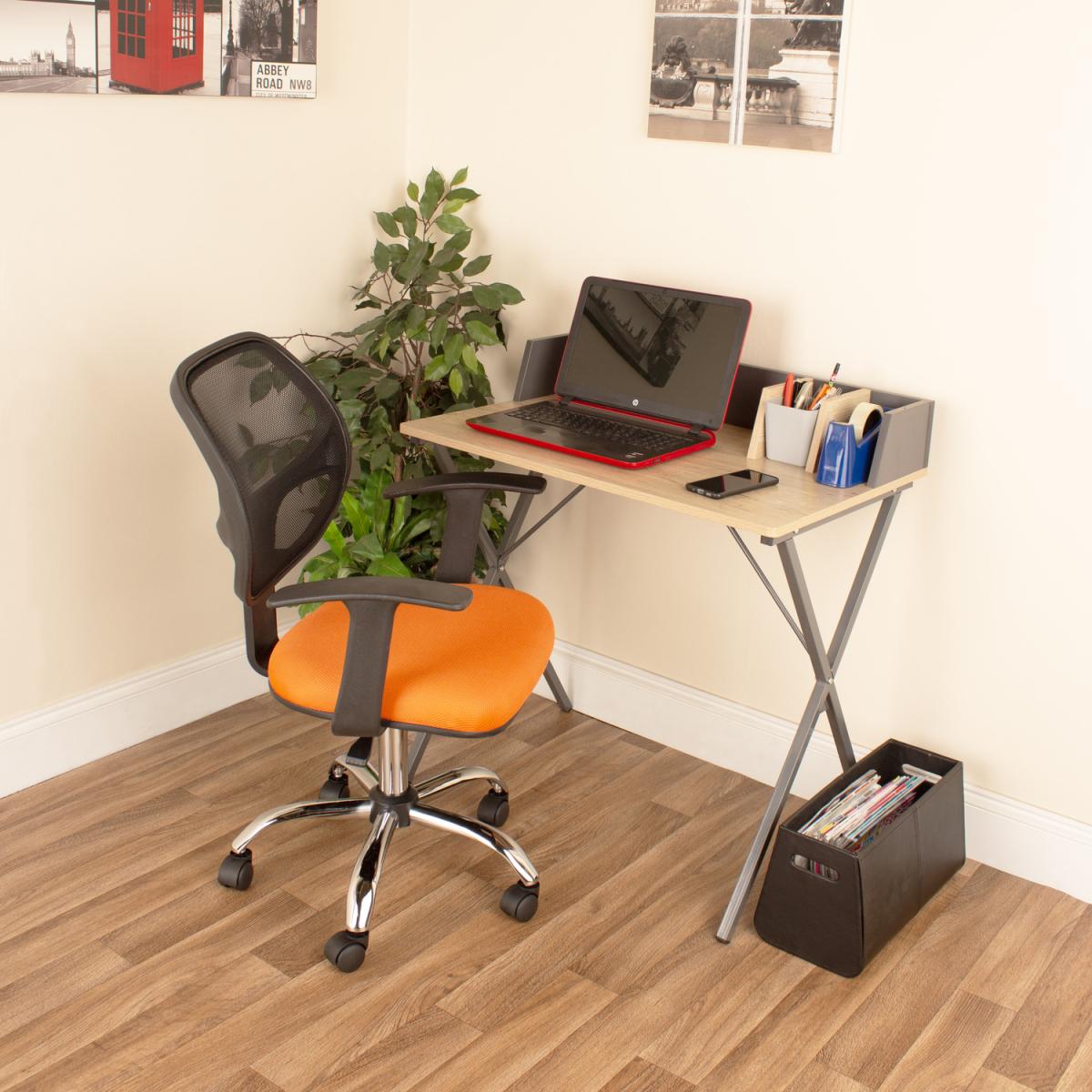 This home office desk and chair set offers a practical solution for your home office or home study area. The desk has a light oak effect foil finish which is hard wearing and easy to clean. The metal legs are grey and coordinate with the upstand at the back of the desktop which has useful dividers. There is a precut hole for easy access for your wiring. The home office chair has an upholstered seat in striking orange fabric and a black mesh back. The base is chrome plated steel with castors and there are arm rests for your comfort. The gas lift enables the height of the chair to be adjustable to suit your requirements. Maximum weight capacity 120 KG.Dimensions:Desk - 80w x 50d x 84h cm Chair - 58w x 57d x 91-101h cm