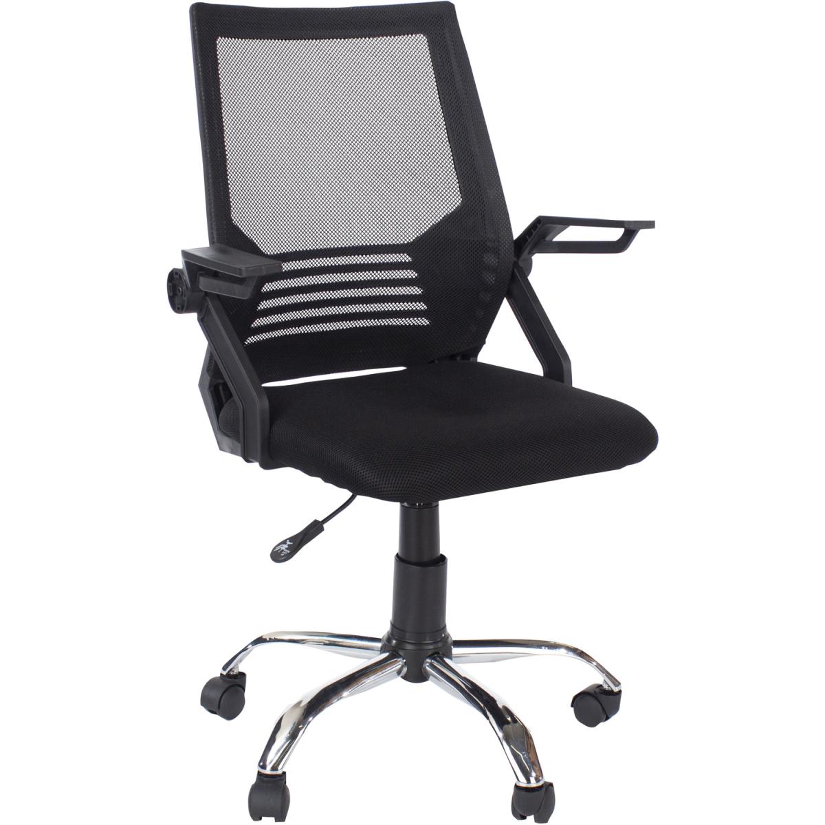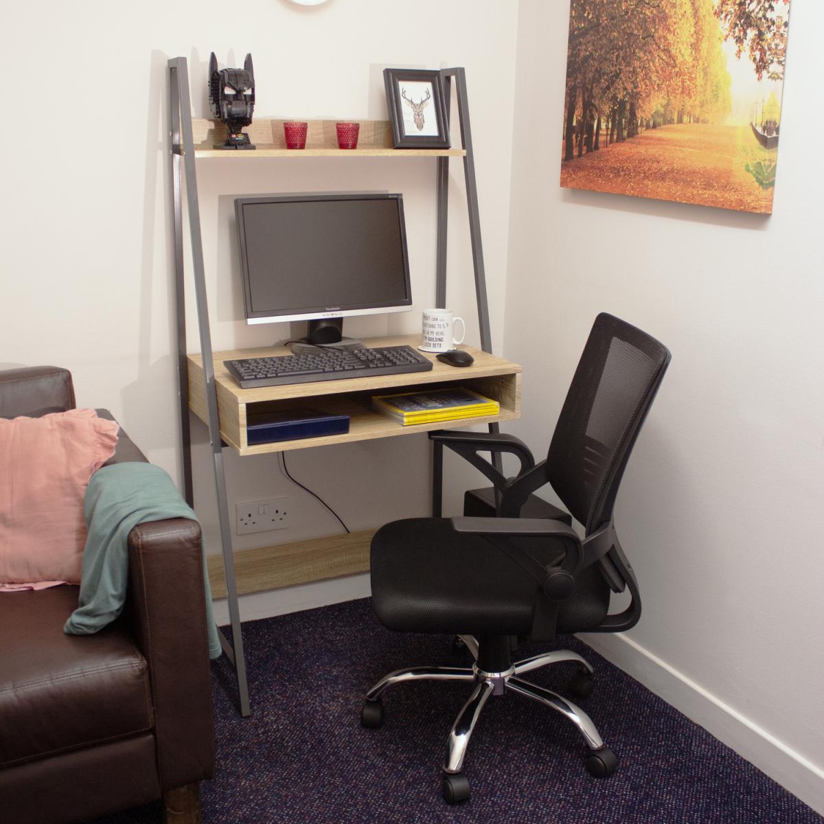 This home office desk and chair set offers a practical solution for your home office or home study area. The ladder design desk unit with graduated shelves has a light oak effect foil finish, which is hard wearing and easy to clean, and a grey metal frame. There is an open storage area under the desk for keeping your essential items close to hand. The home office chair has an upholstered seat in black fabric and a black mesh back. The base is chrome plated steel with castors and the arm rests lift up for ease of access. The gas lift enables the height of the chair to be adjustable to suit your requirements. Maximum weight capacity 120 KG.Dimensions:Desk - 74w x 46d x 146h cm Chair - 61w x 57d x 94-105h cm