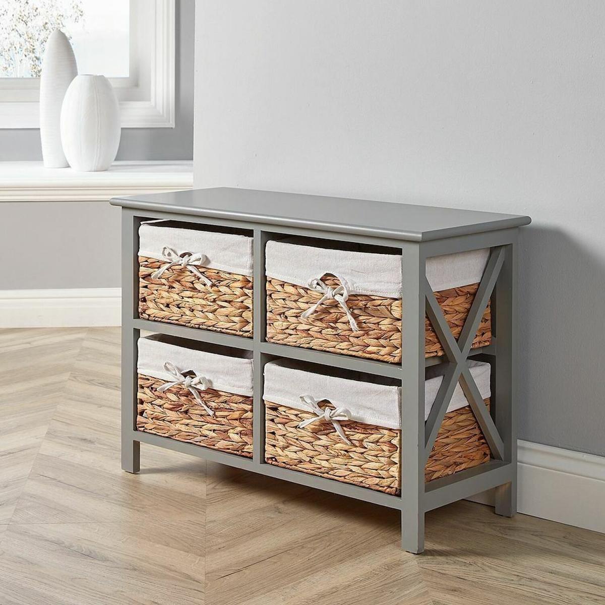 Featured in Grey White, our Dartmouth 4-Basket Wooden Cabinet is full of nautical inspiration. Crafted from solid wood plus durable MDF, it has a naval-style cross brace on each side, echoed in the ties of the white fabric that lines each of the four beautiful and strong woven baskets. This piece gives you both excellent storage space in the baskets and on the top of the generously thick top as well. At this low price, it's worth buying more than one. You can then store books and magazines, bedding and towels, hair and makeup, clothes and accessories, toys and teddies, documents and paperwork.