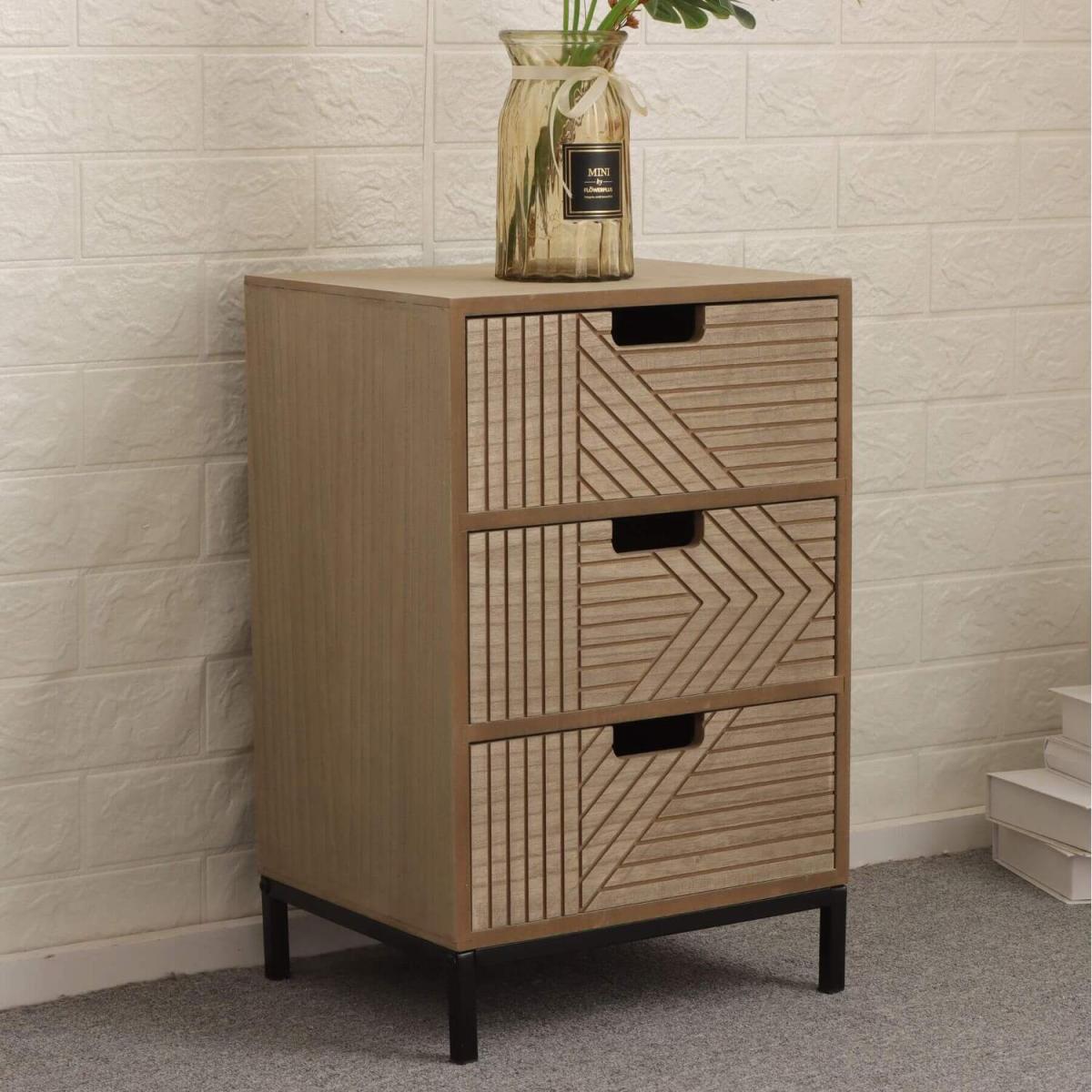 The Modern Mundesley Geometric 3-Drawer Wooden Storage Cabinet with Metal Legs. Crafted from MDF with a paulownia veneer in a light brown finish. It's perfect for adding ample storage space to any room. Also available as a 4 drawer chest. Requires home assembly.