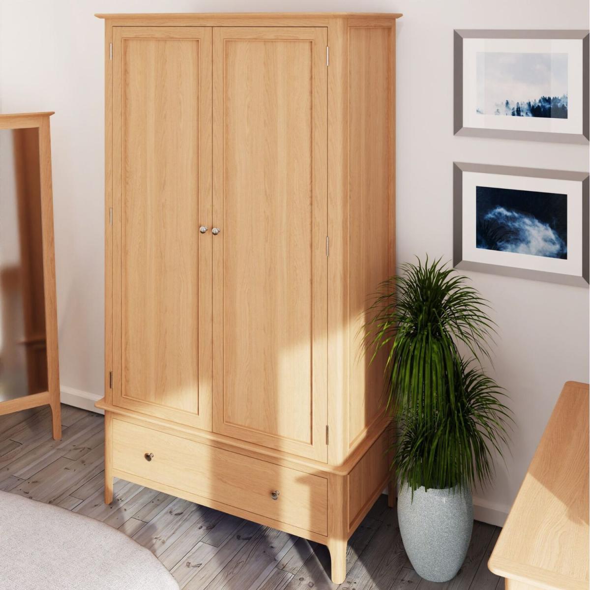 This 2-door wardrobe is from our Natland Collection and is perfect for your bedroom. With its natural oak finish and tapered legs, it pairs beautifully with other pieces from our Natland Collection. The storage drawer features metal ball bearing runners and there is a solid wooden hanging clothes inside. It comes with a choice of chrome and oak handles and is crafted in a solid oak frame with oak veneer panels.