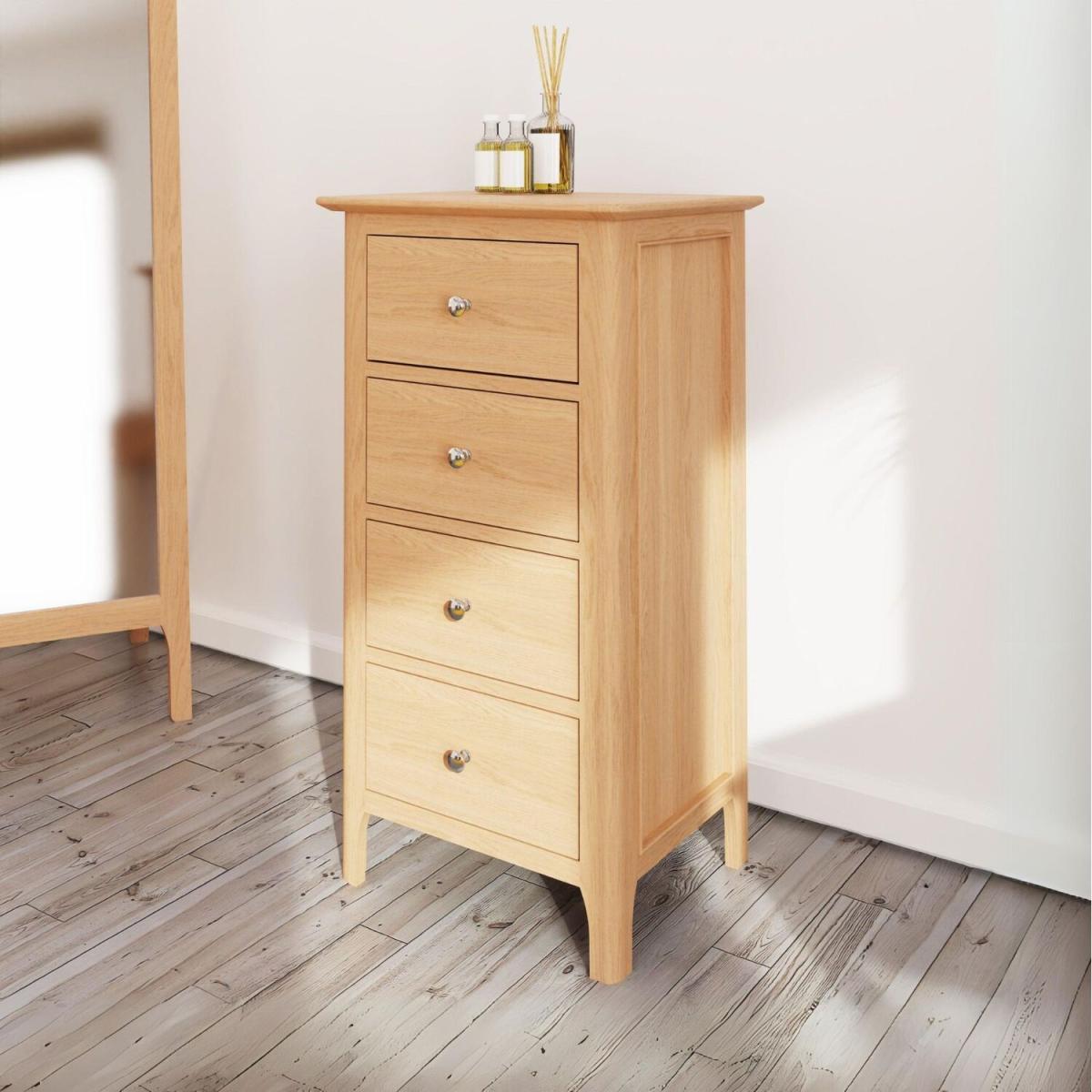 This chest of 4 drawers is from our Natland Collection and is perfect for your bedroom or hallway. With its natural oak finish and tapered legs, it pairs beautifully with other pieces from our Natland collection. This slimline chest features metal ball bearing runners on the drawers and comes with a choice of chrome and oak handles. It is crafted with a solid oak frame and oak veneer panels. A stunning piece of furniture for your home with useful storage space for a small footprint in your room.