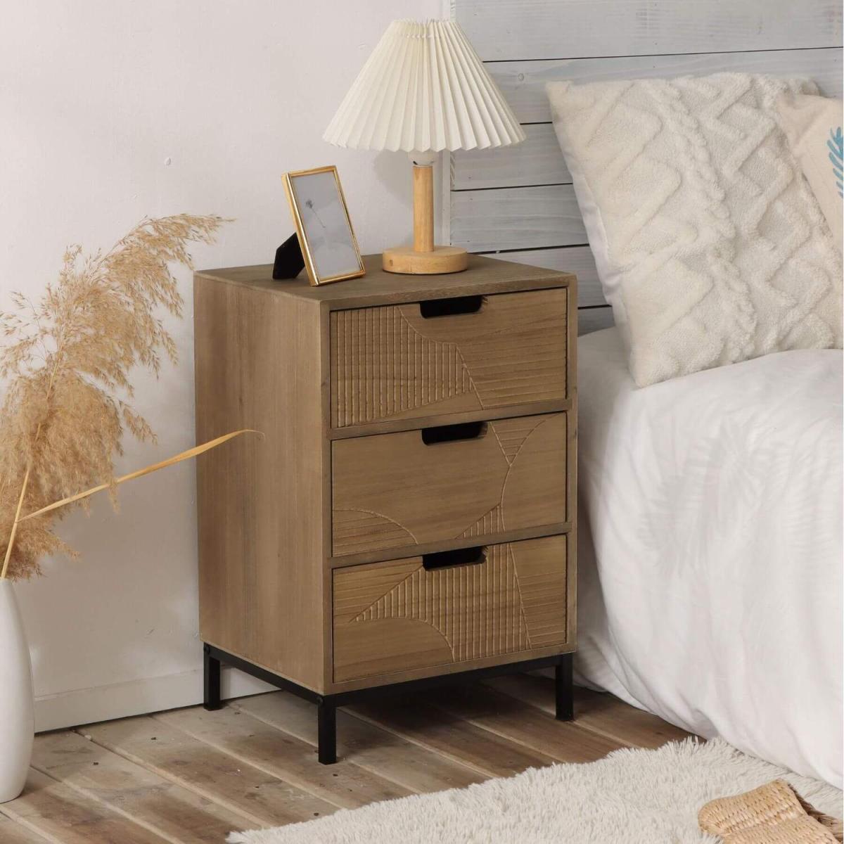 The Modern Reedham Wooden 3 Drawer Storage Cabinet with Geometric Design is a sleek and stylish cabinet, its perfect for any home furnishing setup. Crafted from MDF with a paulownia veneer in a light brown finish and supported by sturdy metal legs, this cabinet adds a touch of elegance to any room. Requires home assembly.