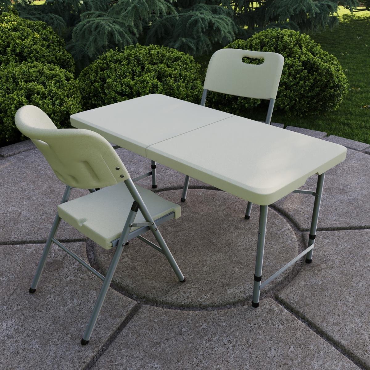 Discover the perfect blend of convenience and functionality with our Folding Table and Chair Set. This thoughtfully designed set ensemble a seamless combination of style and practicality for both indoor and outdoor settings. Equipped with built-in carry handles, this set provides ultimate portability, allowing you to effortlessly transport the folding table and chairs to any location. From impromptu picnics to cozy indoor gatherings, enjoy versatile seating and dining options that cater to your ever-changing needs. 4ft Table 2 Chairs