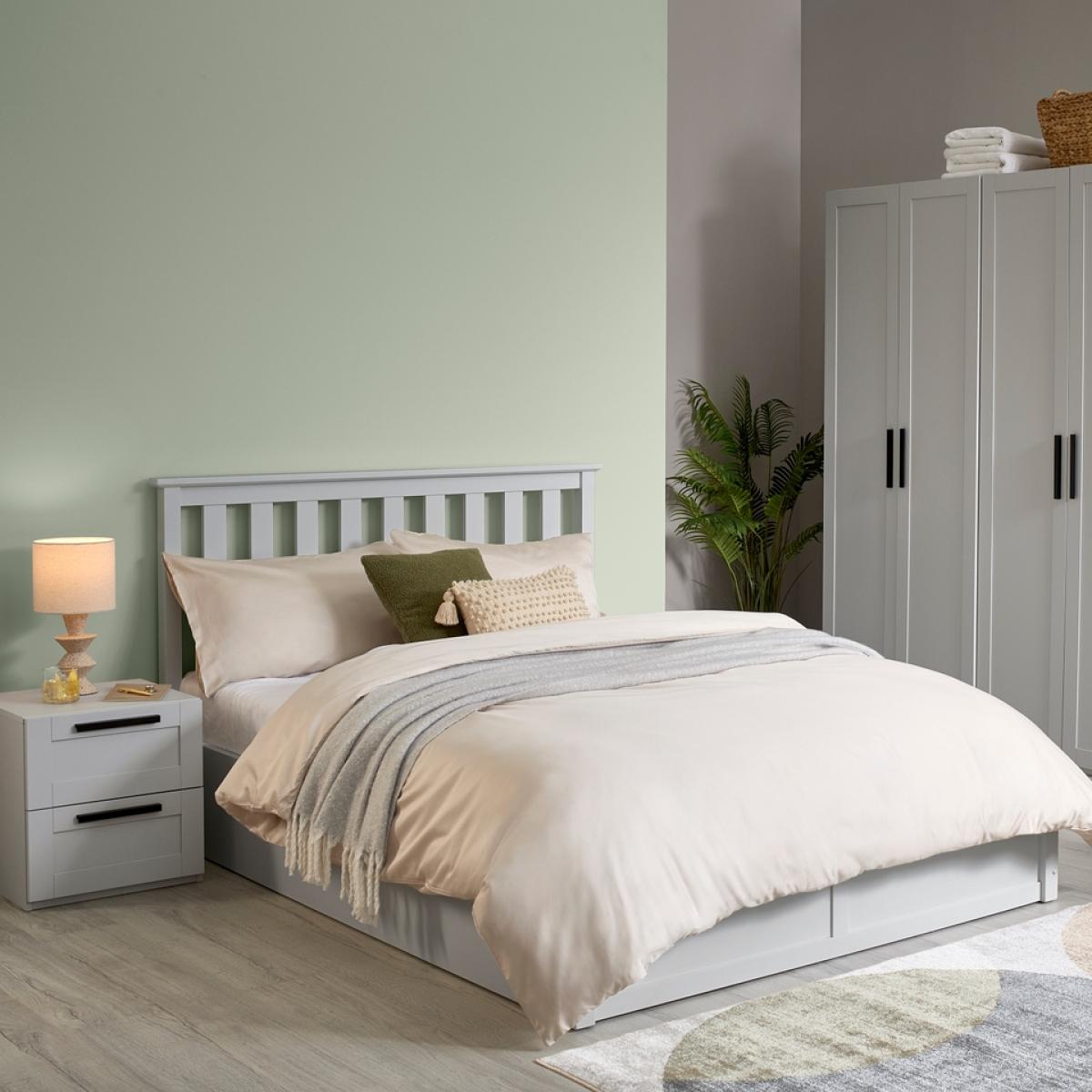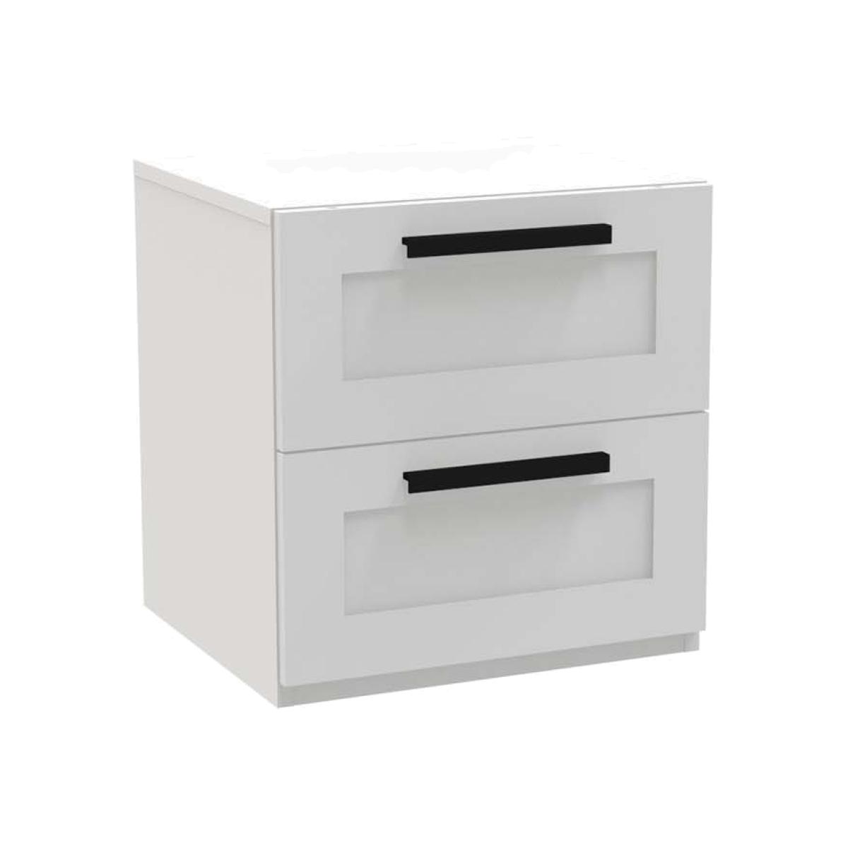 The Homebase modern shaker style two-drawer bedside table is the perfect finishing touch for your bedroom, featuring a calming matt grey finish that complements a variety of décor styles. Its contrasting black handles add a modern edge to the classic shaker design. The two spacious drawers provide convenient storage for nighttime essentials, helping keep your space organised and clutter-free, while its compact size makes it an ideal choice for both large and small bedrooms alike.