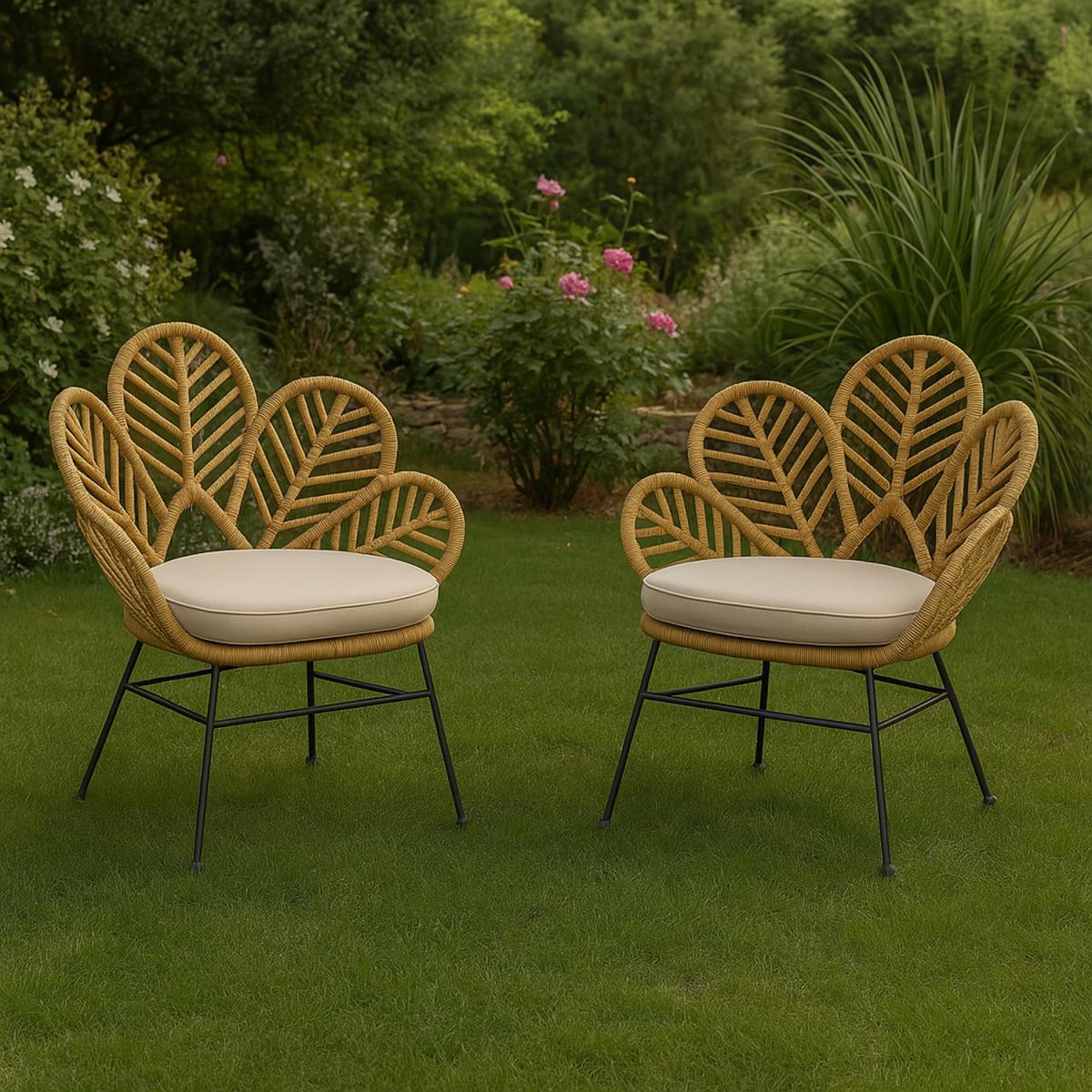 Floral Rattan Chair Add a touch of tropical charm to your home or garden with this Floral Rattan Chair. The eye-catching leaf-shaped backrest and natural rattan-effect frame bring style and elegance to any space. With sturdy black metal legs and a soft cream cushion, it's perfect for both indoor and outdoor use. Whether you're relaxing in the sun or entertaining indoors, this chair offers comfort and standout design. It's also easy to maintain, making it a practical addition to your home or patio.
