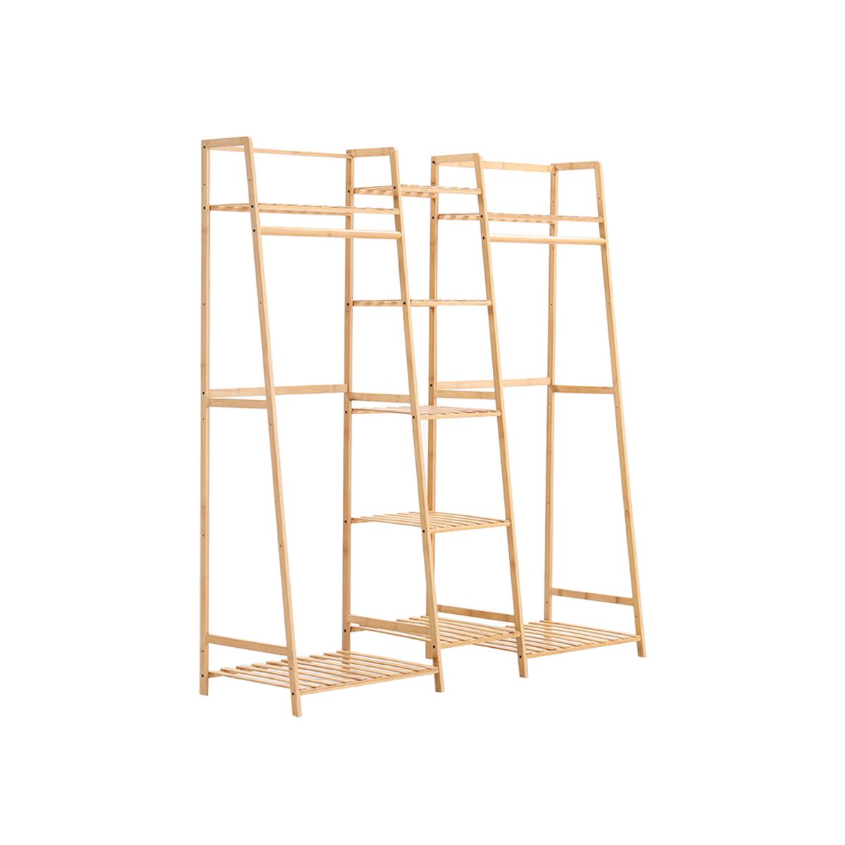Crafted from eco-friendly bamboo, this trapezoid clothes rack combines durability and style. Featuring five spacious shelves and a hanging rod, it offers ample storage for your clothing and accessories. Its freestanding design helps organize and declutter your space, making it a perfect solution for seasonal items. Keep your room tidy and stylish with this practical and functional bamboo rack.