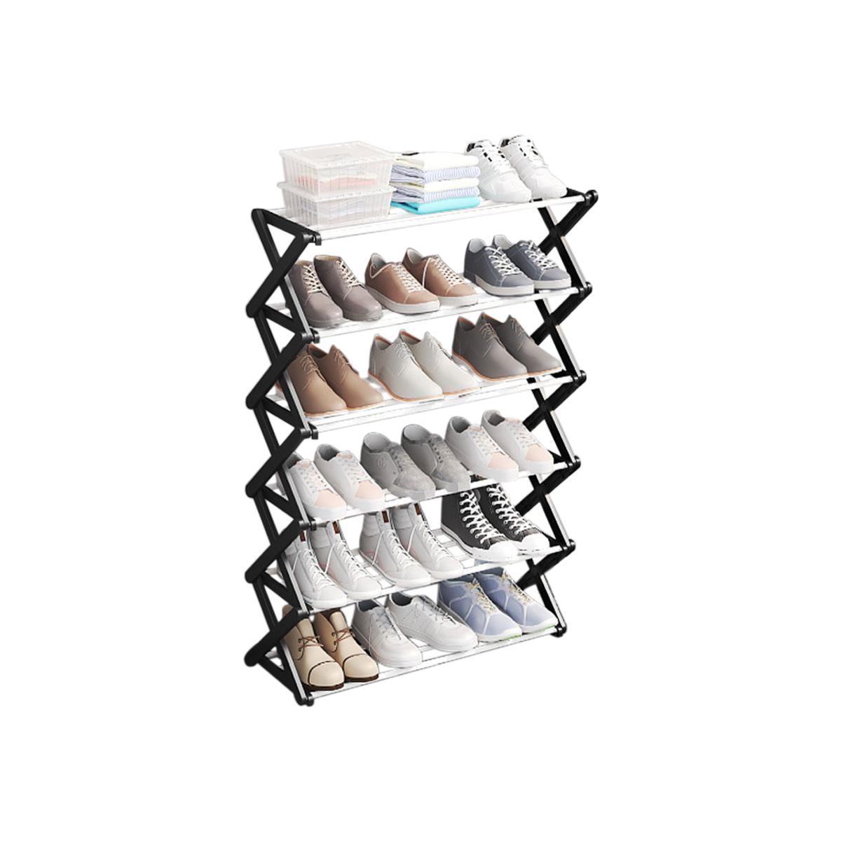 This 6-Tier Shoe Storage Foldable Metal Rack offers a sleek way to organize up to 18 pairs of shoes. With its X-shaped side frames and spacious shelves, it fits sneakers, heels, boots, and more. The foldable design requires no tools for setup, making it easy to use anywhere. Ideal for closets, entryways, or living rooms, it combines function with modern style.